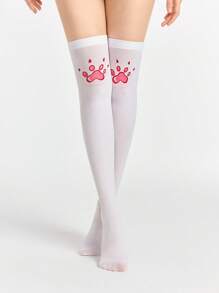 Anime 1 Pair Cute Cat Paw Print Thigh High Socks, Thin & Elastic Solid Color Knee-High Socks, School Style Socks