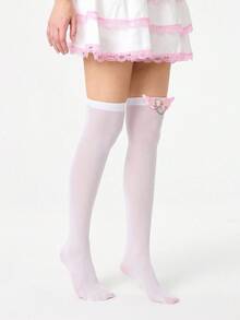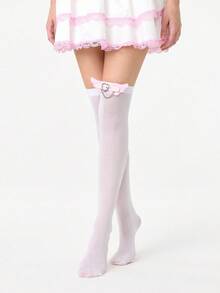 Anime 1 Pair Cute Pink Fluffy Wing Over-The-Knee Socks, Lolita Heart Lock Chain Element Belt Decor Thigh High Socks, Thin Elastic Sheer Tights For Daily Wear