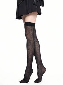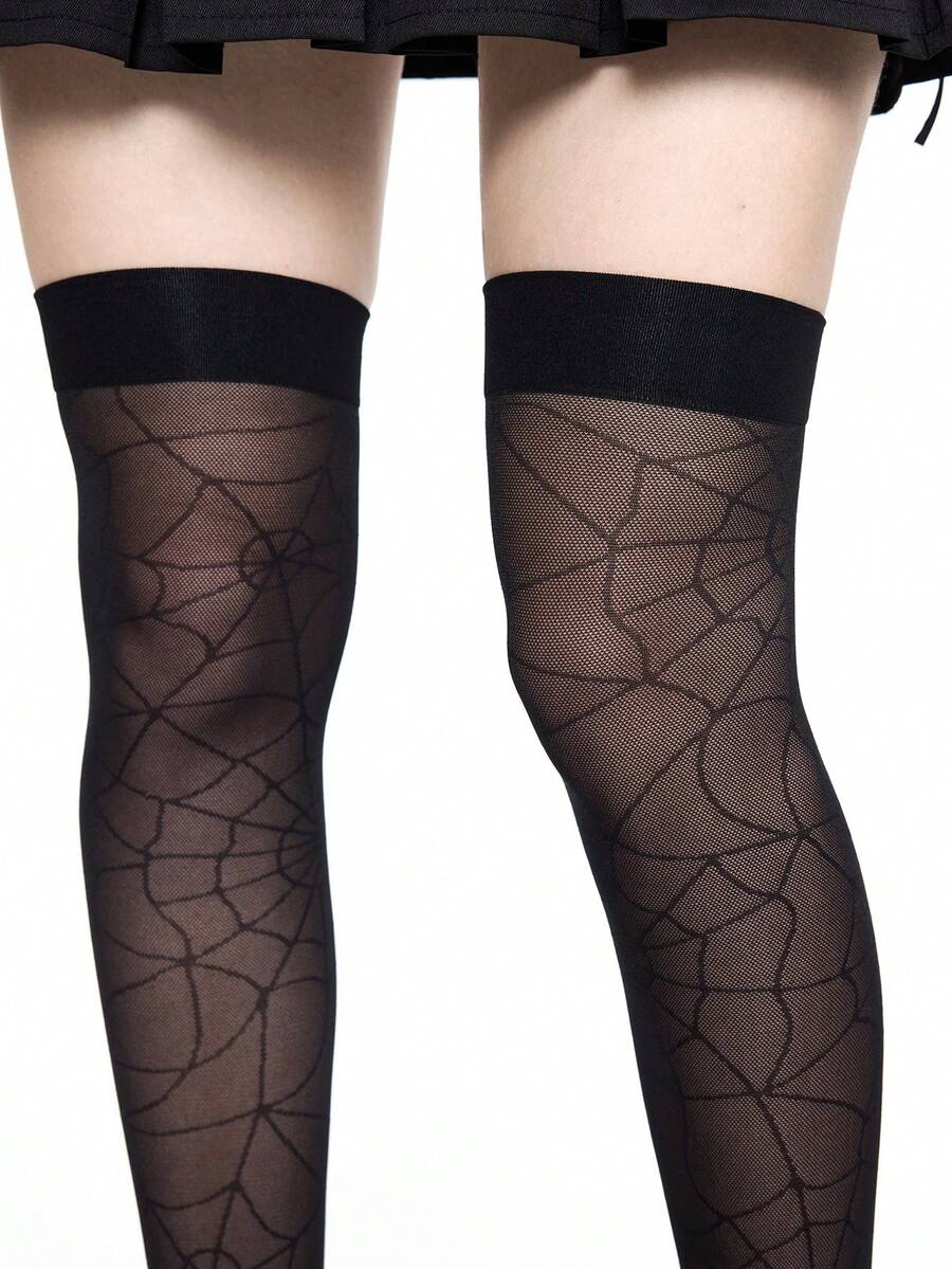 Grunge Punk 1 Pair Sexy Spider Web Thigh High Socks, Black Solid Color Sheer Elastic Tights, Suitable For Halloween