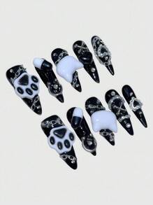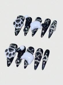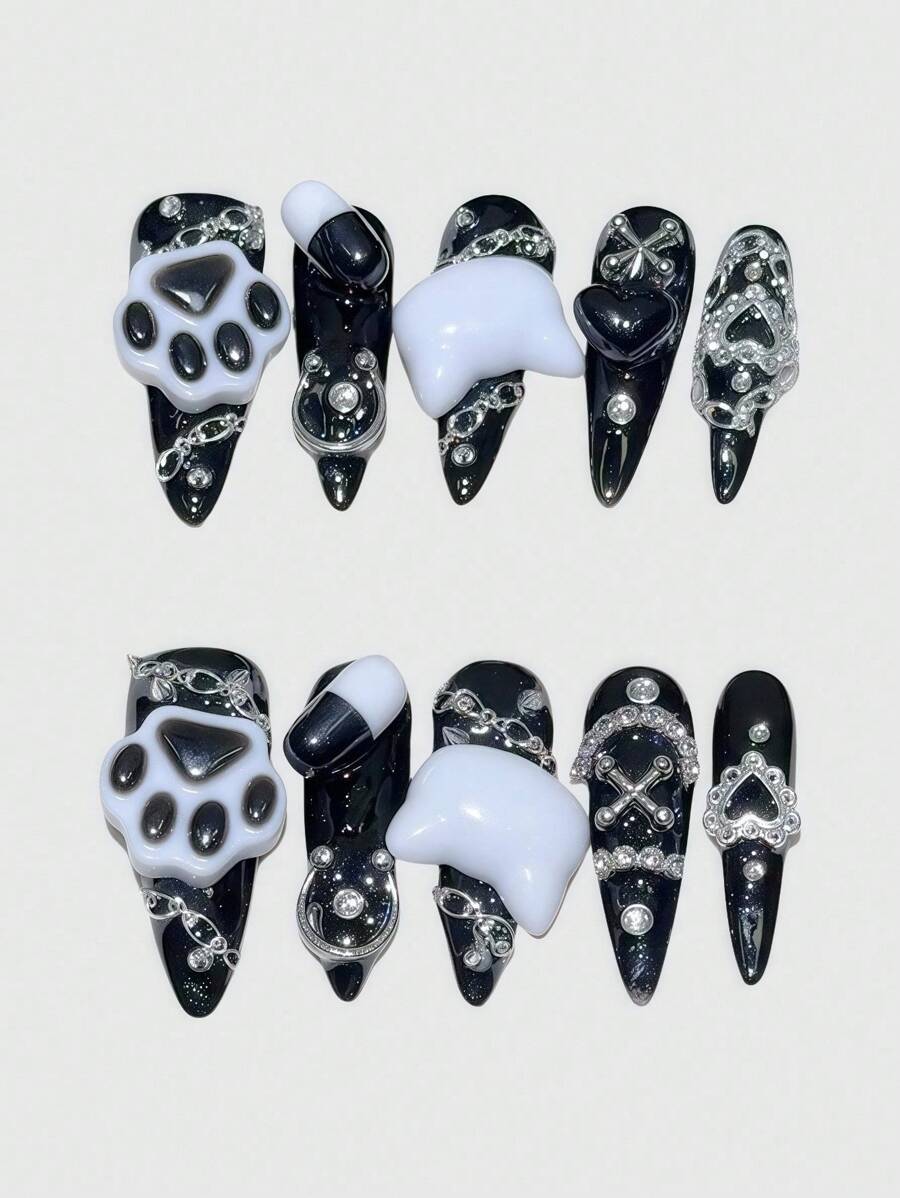 Kawaii 10pcs Black Y2K Personalized Pill Decor Cute Cat Paw Punk Metal Cross Chain Dark Style Handmade False Nail Tips, Suitable For Daily Outing And Dates For Millennium Girls
