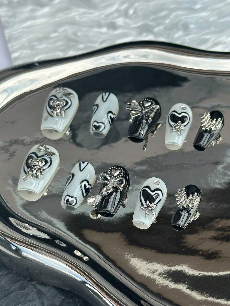 Goth 10pcs Heart Pattern Fake Nail & 1sheet Tape