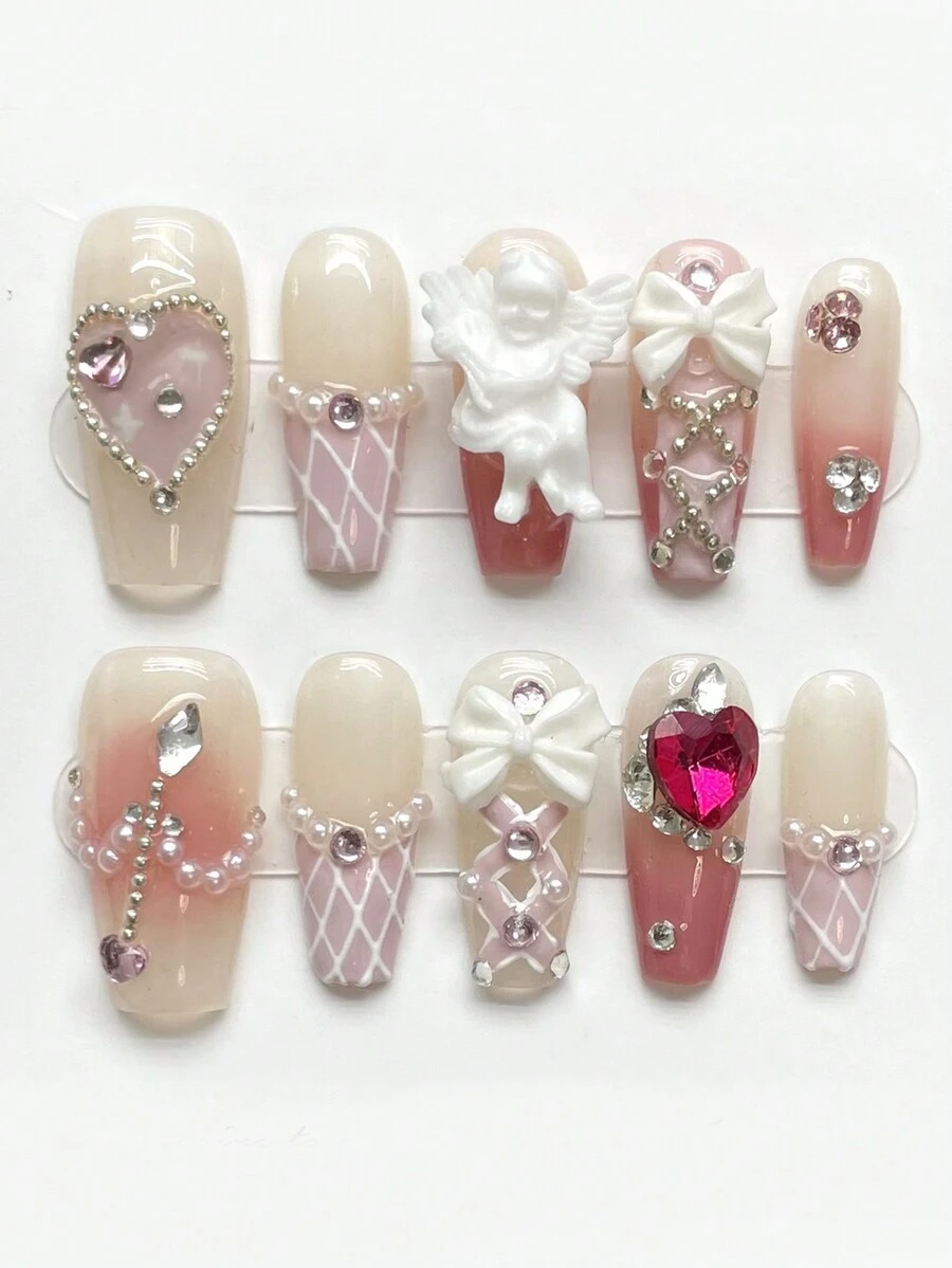 Kawaii 10pcs Long Coffin 3D Bow Decor Fake Nail & 1sheet Tape