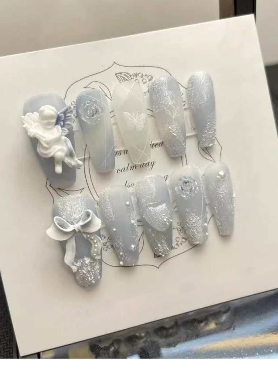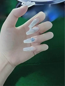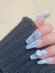 10pcs Long Coffin 3D Flower Decor Fake Nail & 1sheet Tape