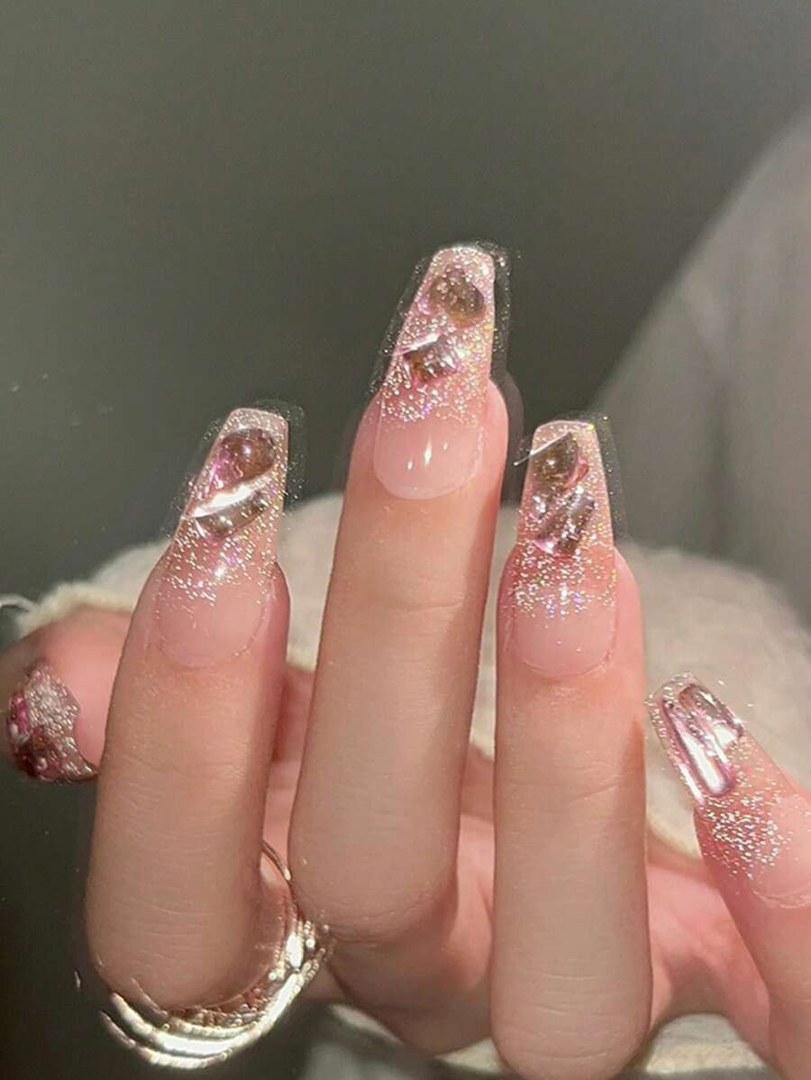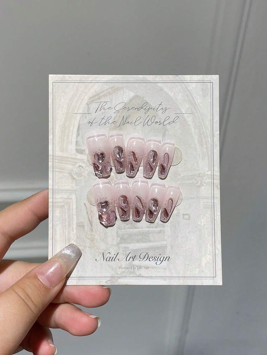 10pcs Long Coffin 3D Rhinestone Decor Fake Nail & 1sheet Tape