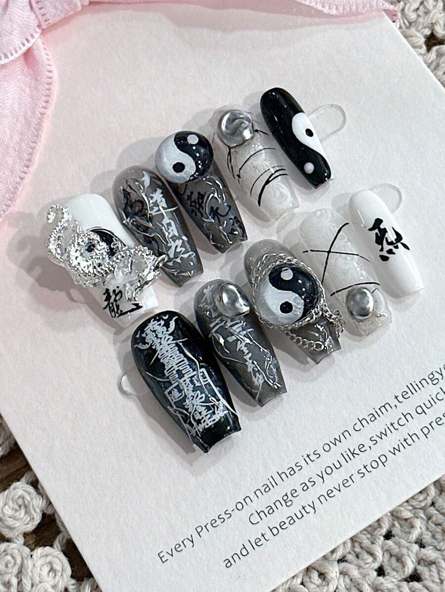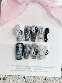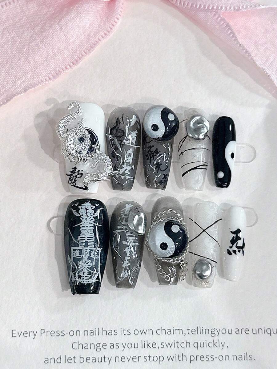 Goth 10pcs Long Coffin Yin & Yang Decor Fake Nail Kit