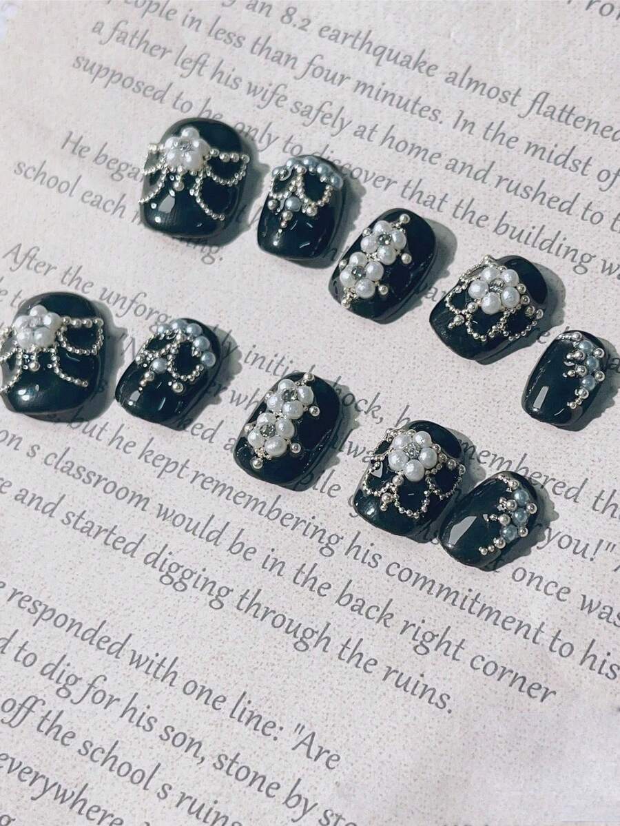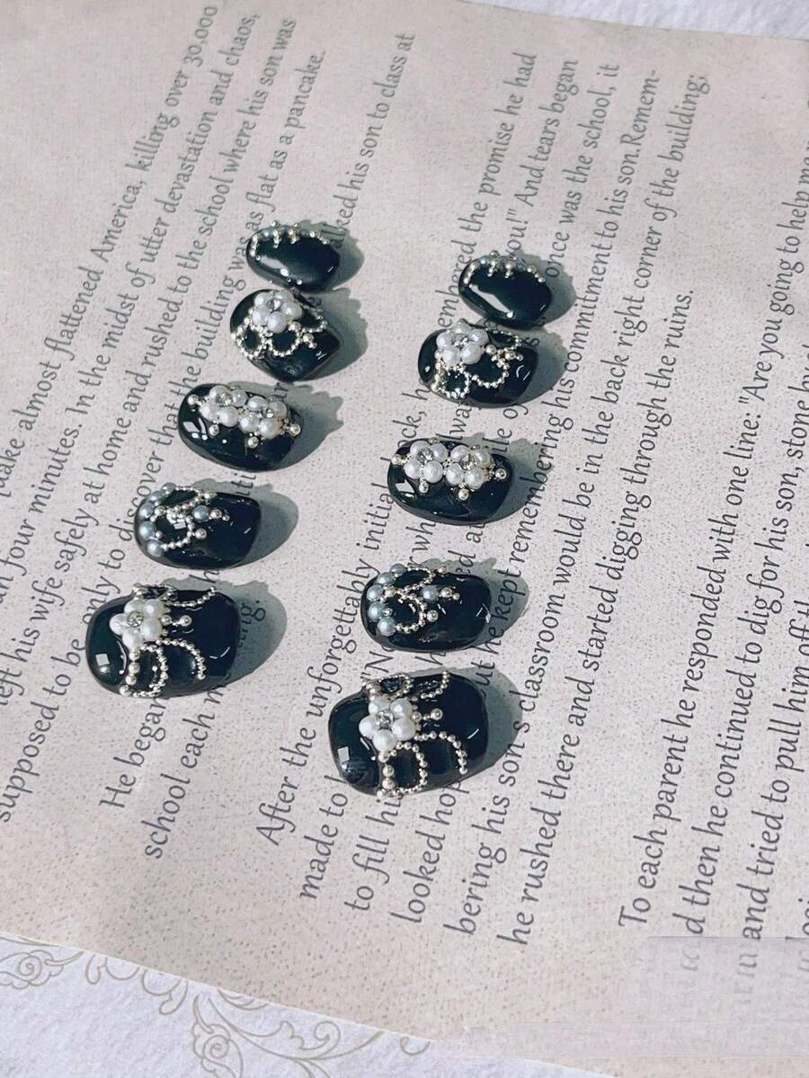 Goth 10pcs Short Square 3D Rhinestone & Faux Pearl Decor Fake Nail & 1sheet Tape