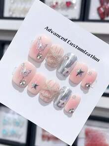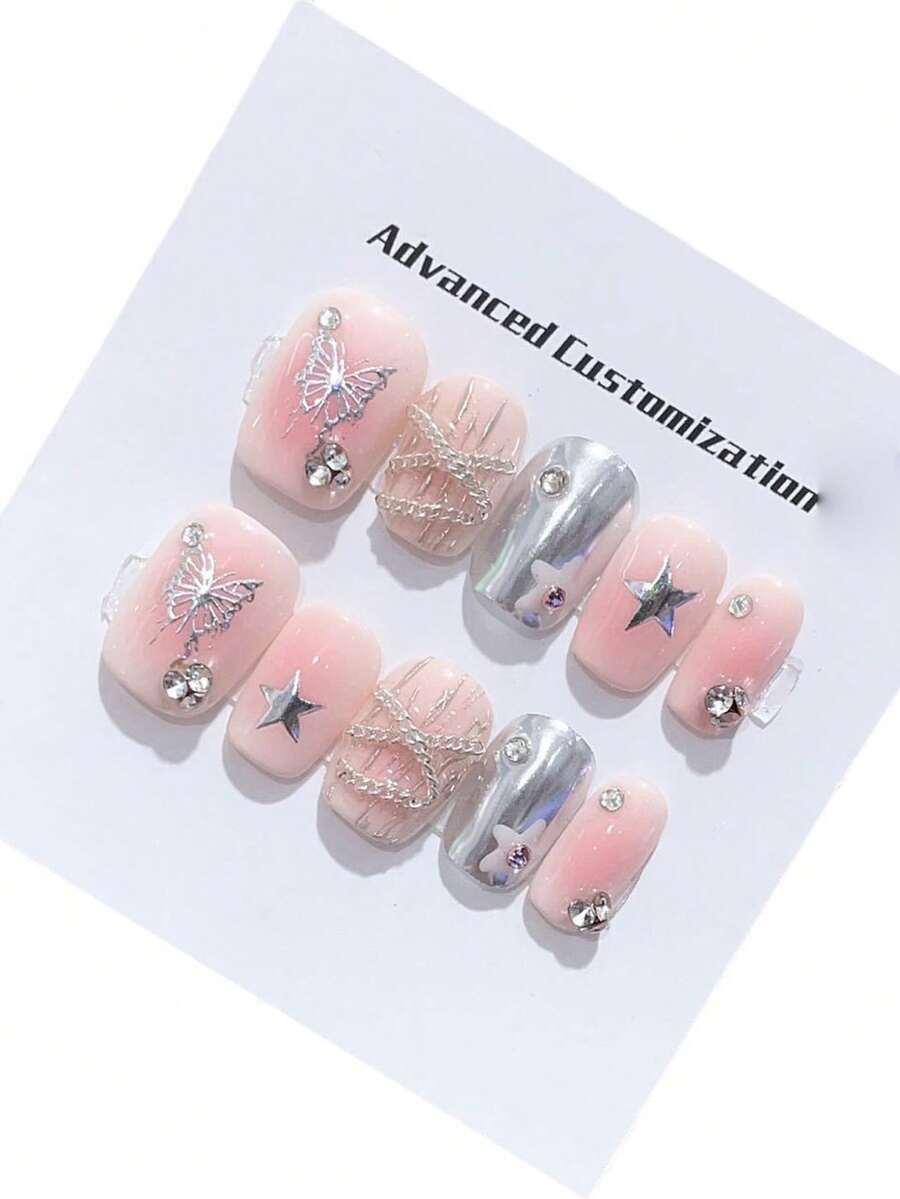 Kawaii 10pcs Short Square Butterfly & Rhinestone Decor Fake Nail & 1sheet Tape
