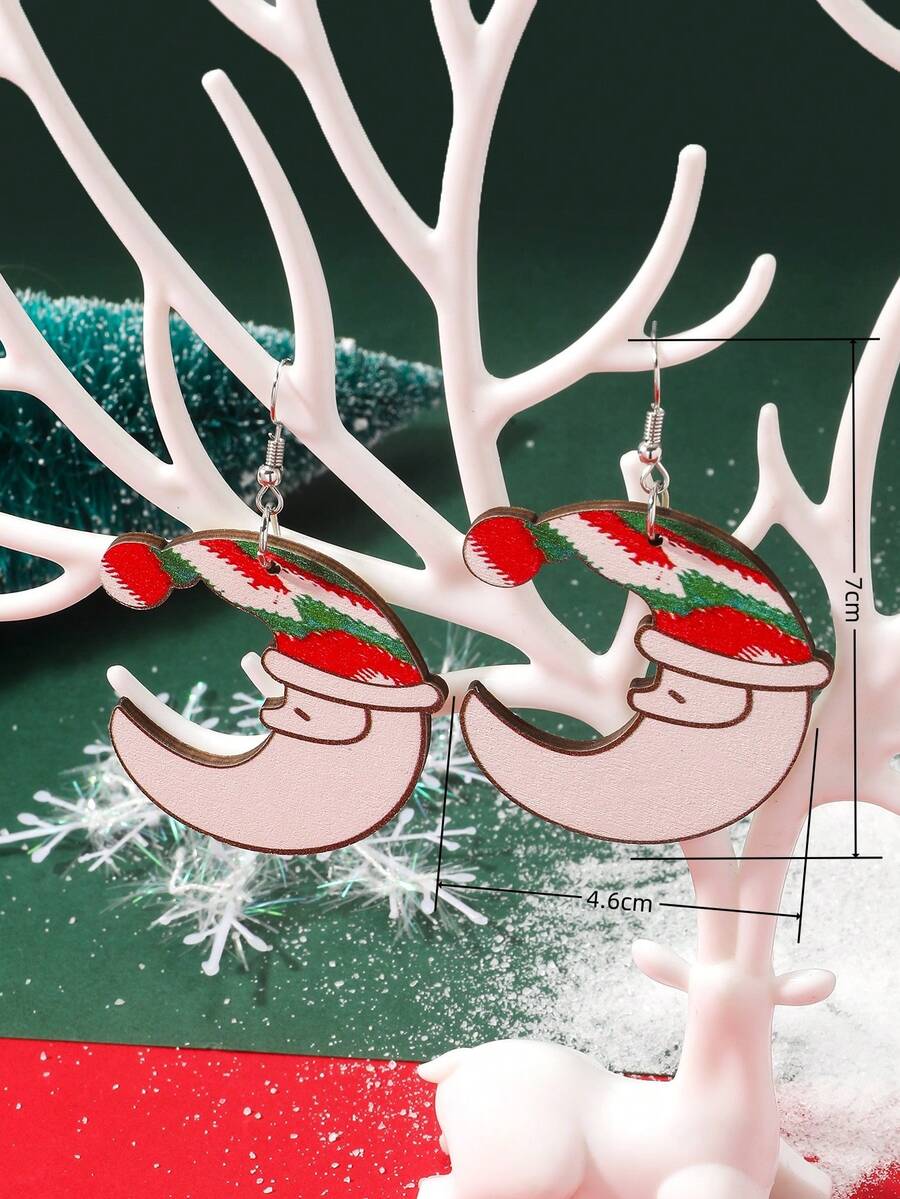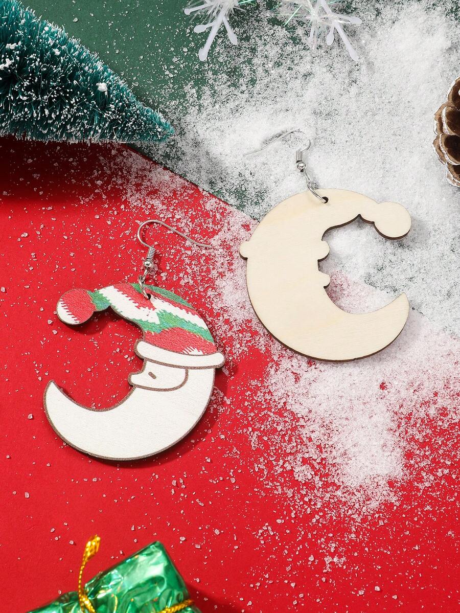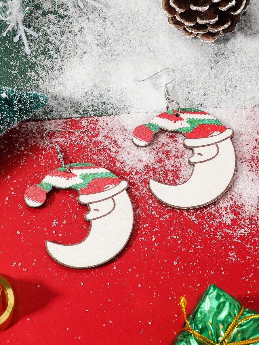 1pair Christmas Themed Creative Santa Hat & Moon & Santa Claus Shaped Wooden Earrings