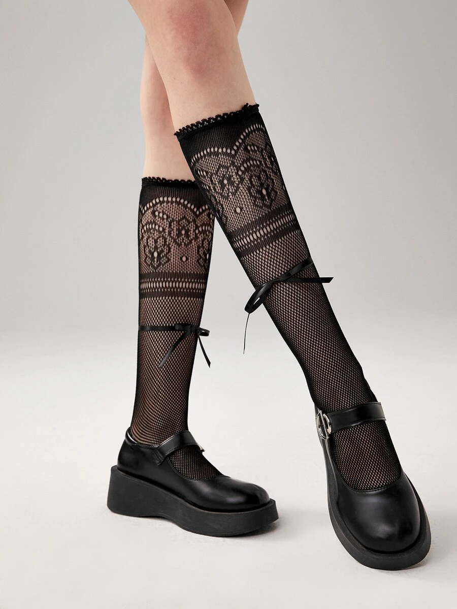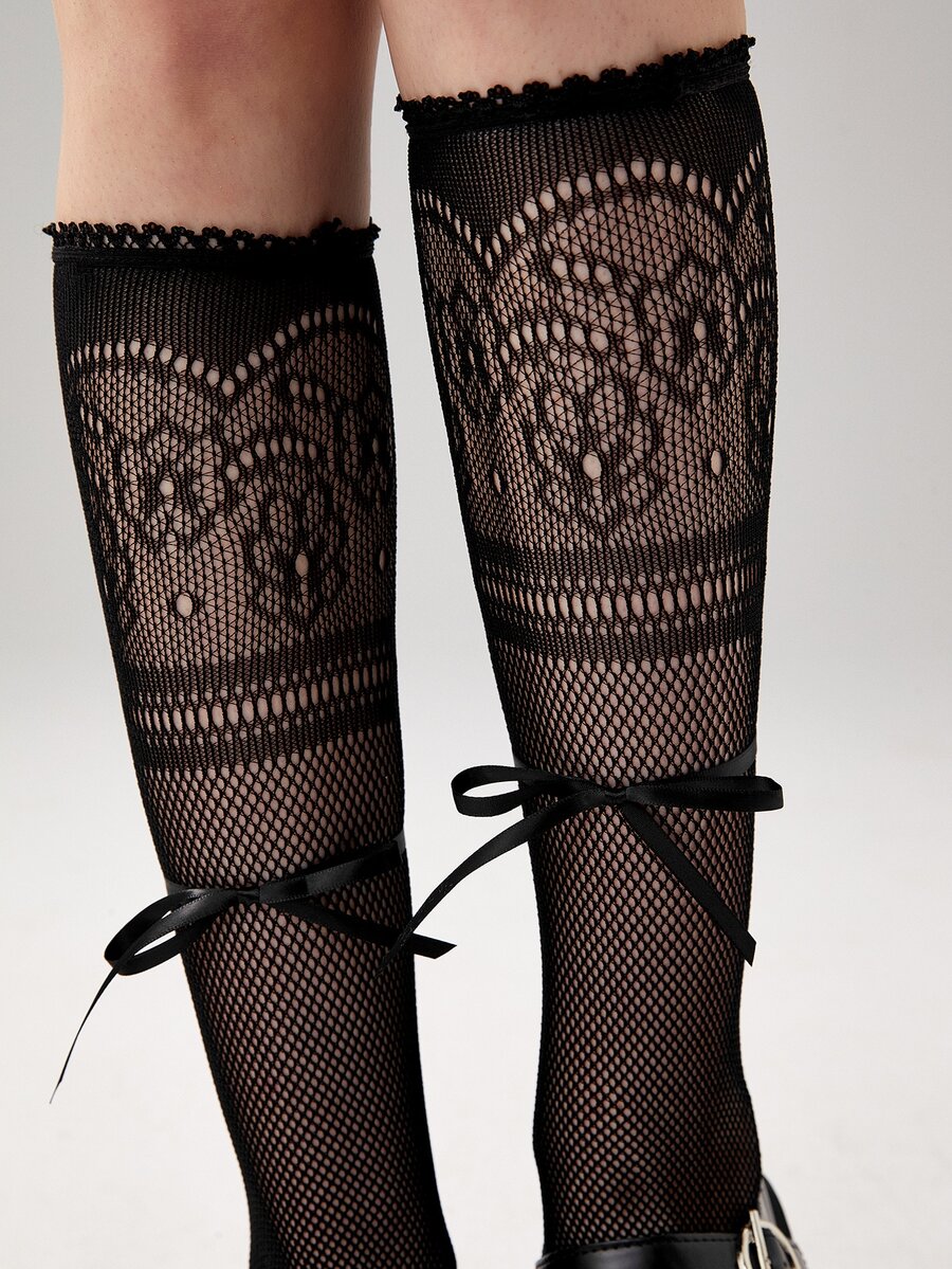 1pair Women Flower Pattern Bow Decor Fashion Over The Calf Socks For Daily Life