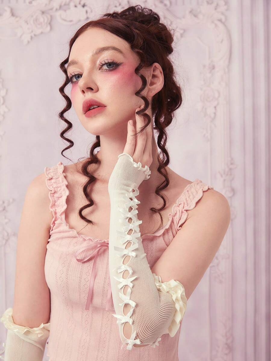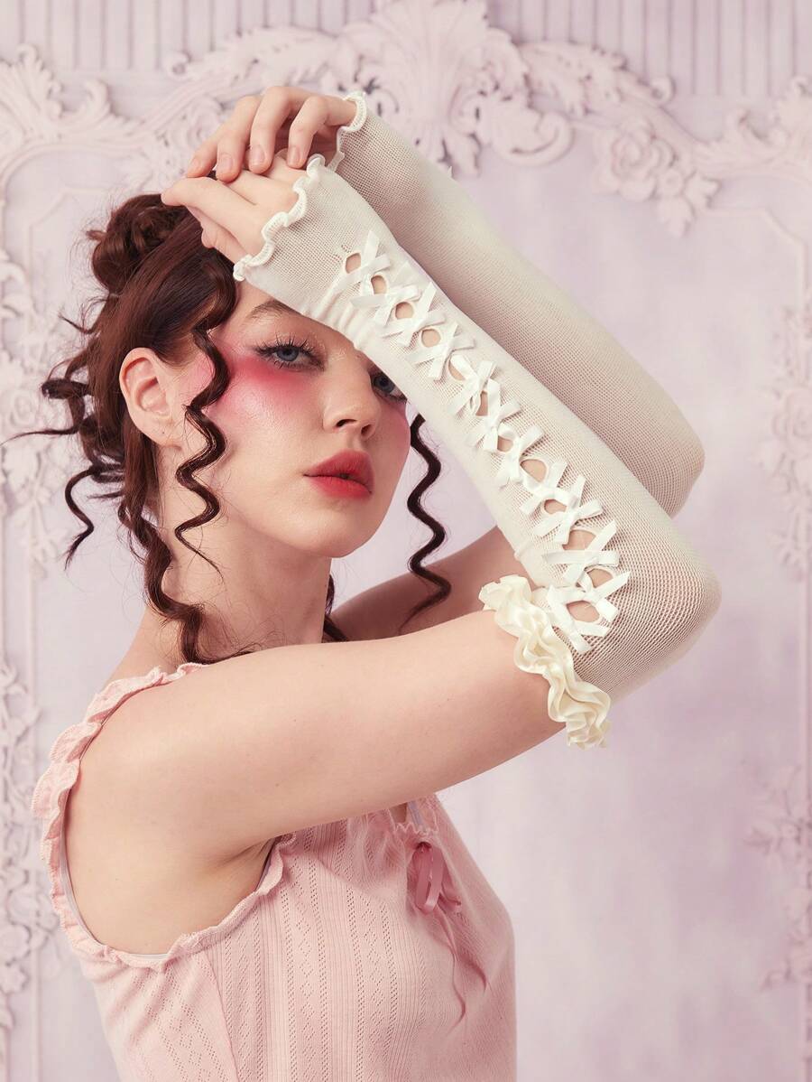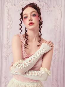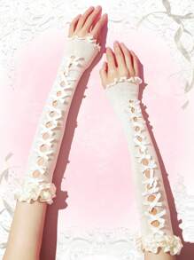 Sweetness 1pair Women Lettuce Trim Bow Decor Cut Out Arm Sleeves