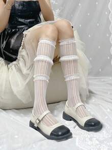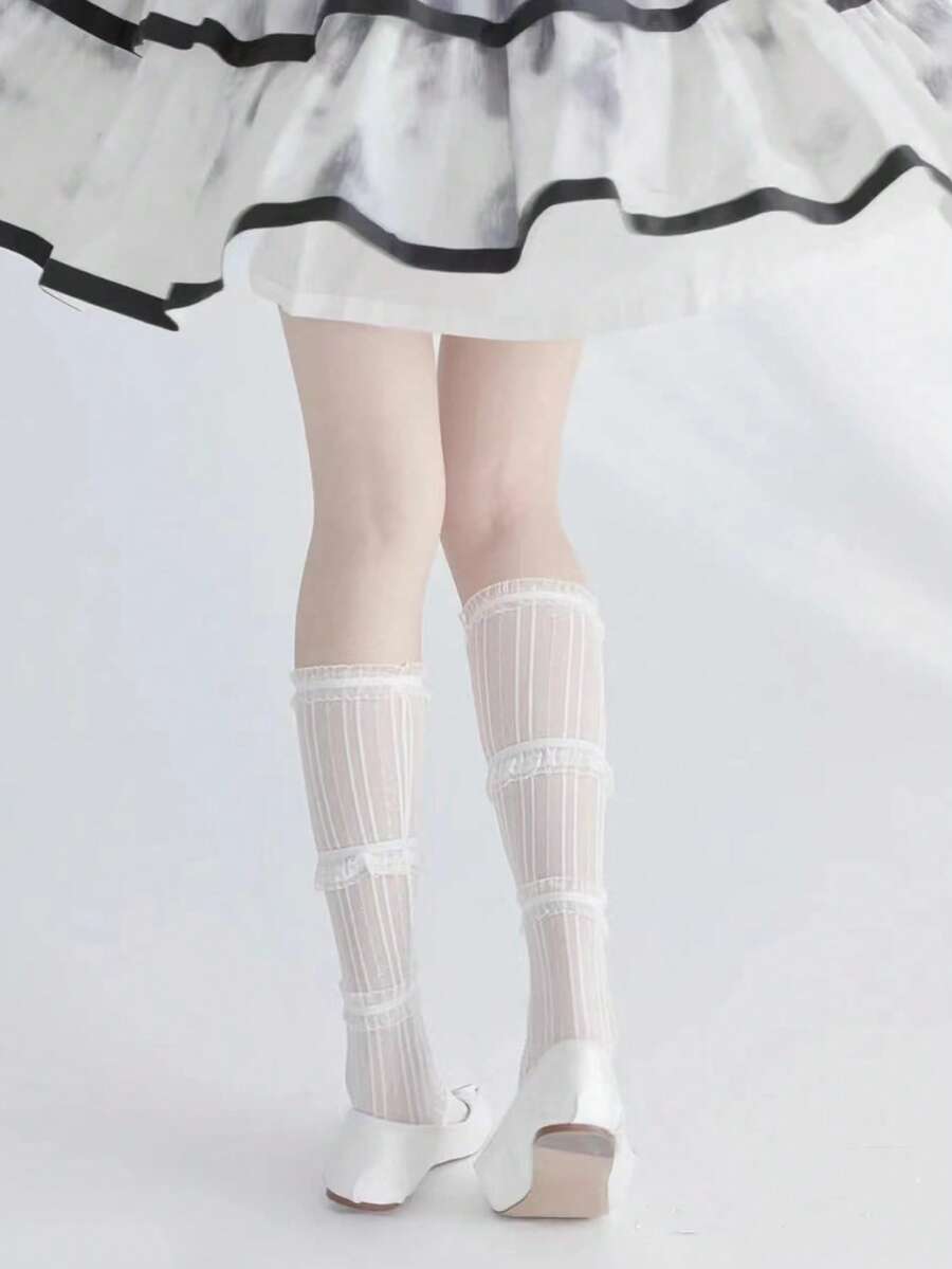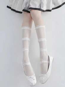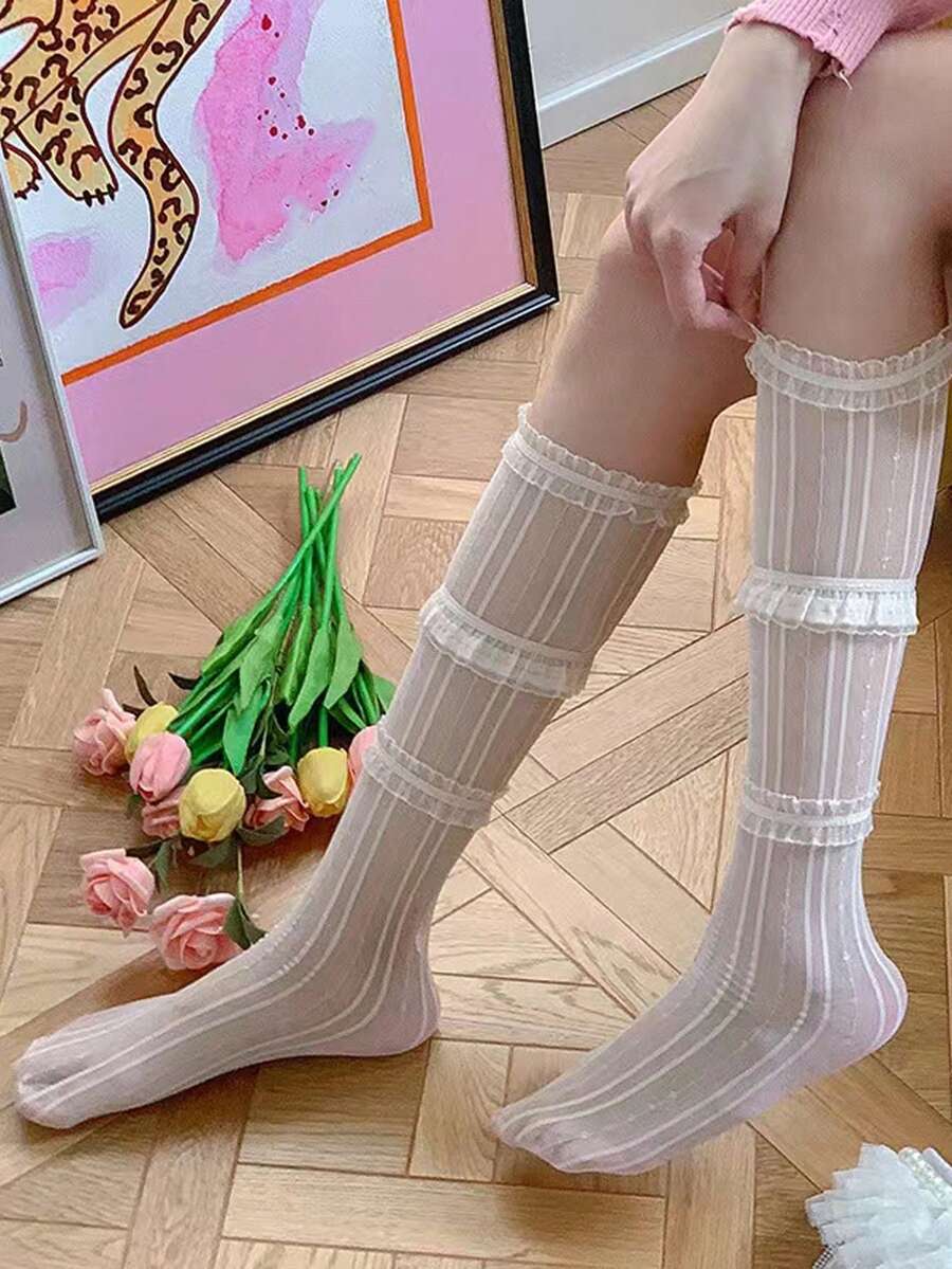 Sweetness 1pair Women Solid Frill Fashion Over The Calf Socks