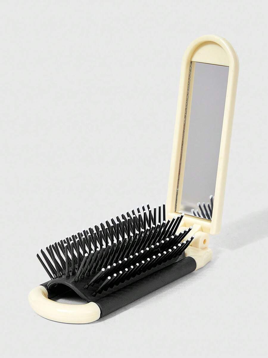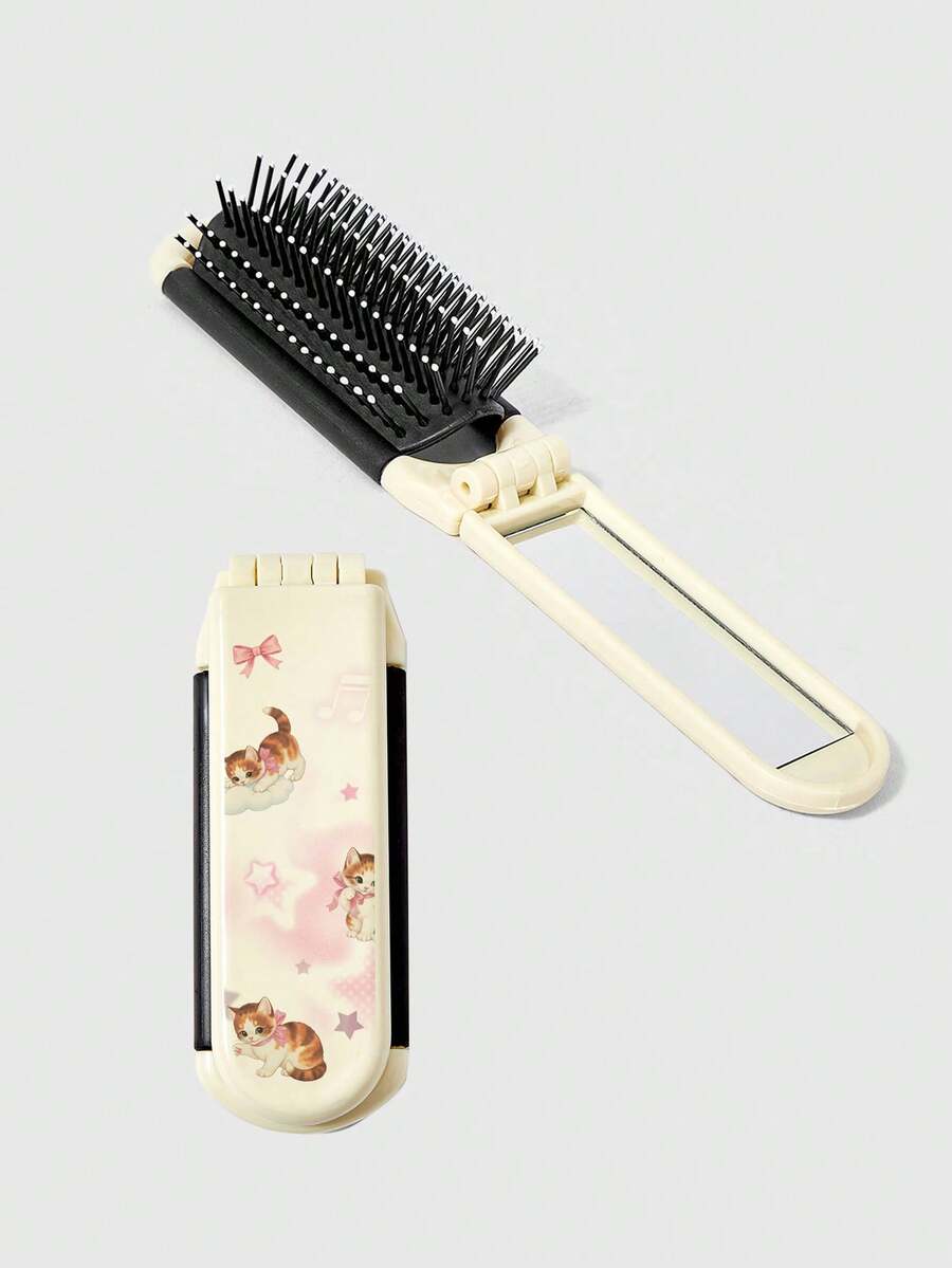 Kawaii 1pc Cherry Smile Back To School Print Folding Hair Comb With Mirror, Portable All-In-One Styling Tool