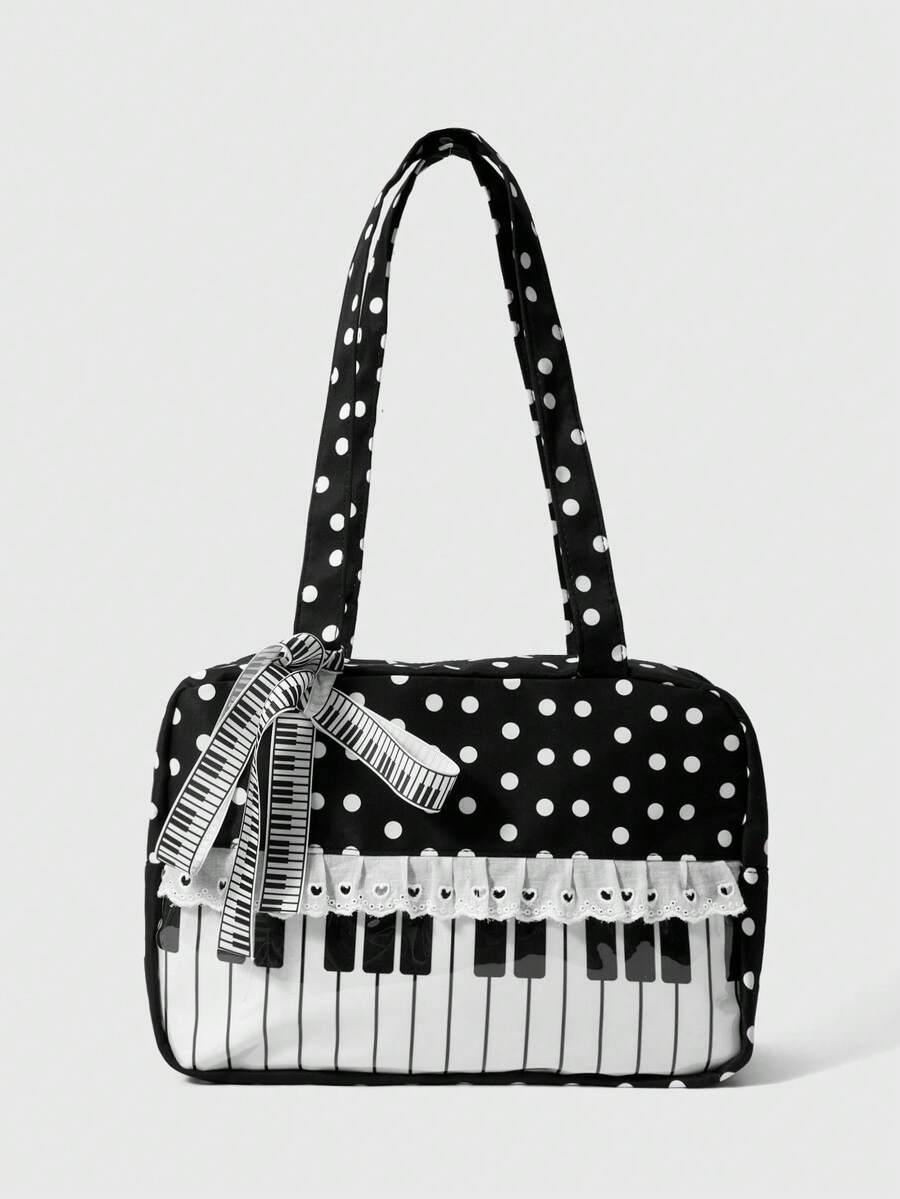Anime 1pc Cute Sweet Bow Heart Lace Patchwork Polka Dot Pop Art Women Tote Bag, 2nd Gen Snack Quantity Music Note Music Festival Transparent Layer Badge Doll Display Shoulder Bag, Suitable For Shopping, Campus