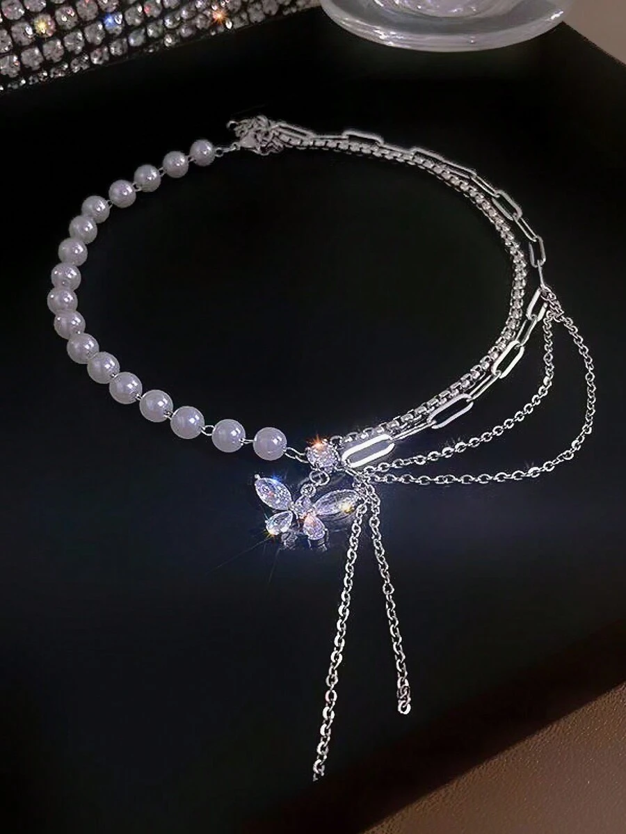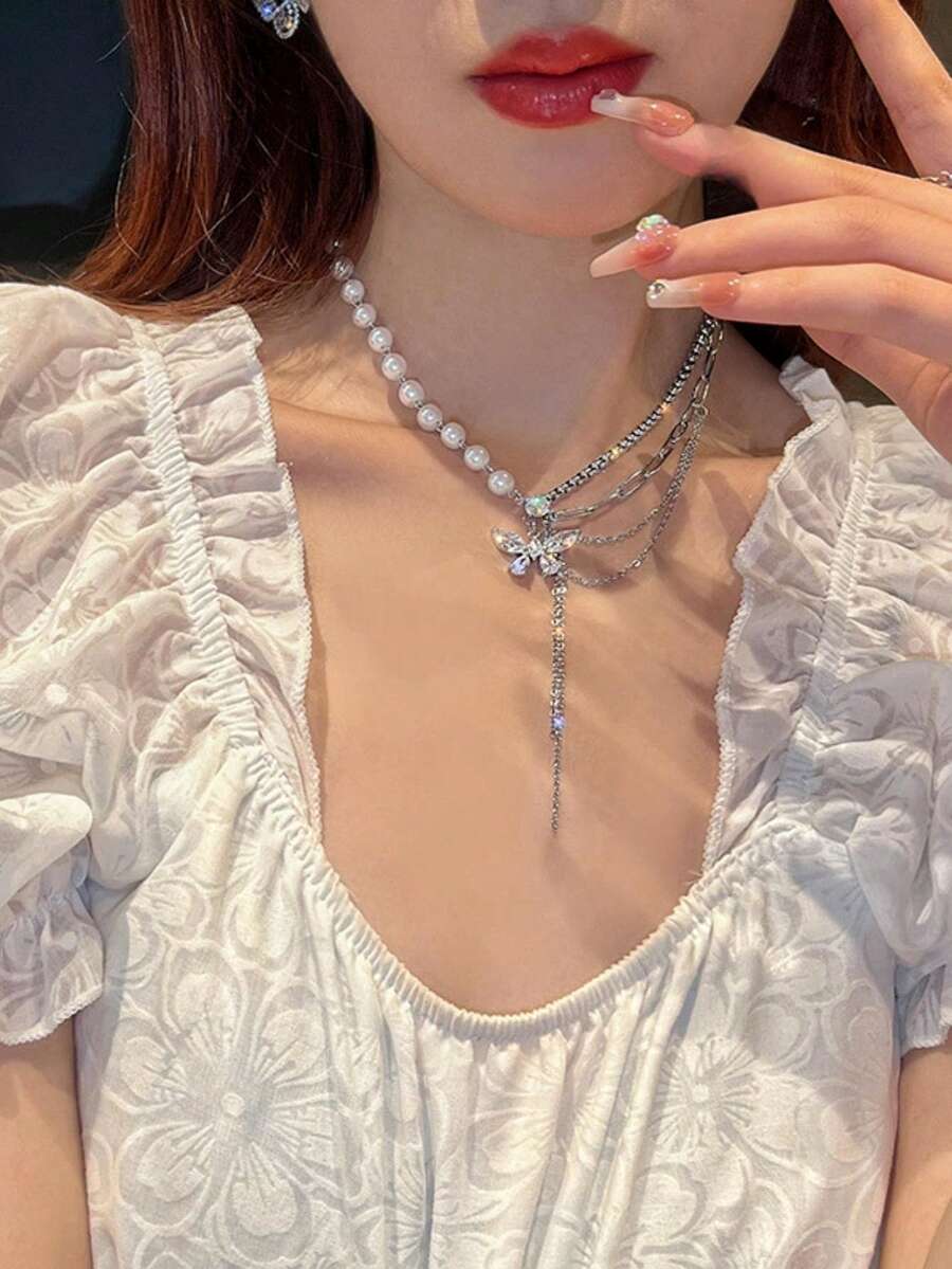 Fairycore Exquisite Elegant Butterfly & Faux Pearl Decor Pendant Necklace