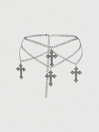 1pc Women's Black Lace Elastic Fabric 3-Layer Chain Cross Skull Spider Web Decor Gothic Style Cinched Waist Dress Accessory, Versatile For Daily Wear