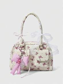 1pc Pink Corduroy Bow Polka Dot Print Fashion Portable Bow Pearl Decor Kawaii Ladies Tote Bag, Large Capacity