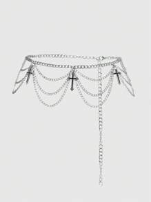 1pc Women Black & Silver Gothic Style Waist Chain With Cross Pendant And Triple Layer Chains, Great For Daily Wear, Halloween