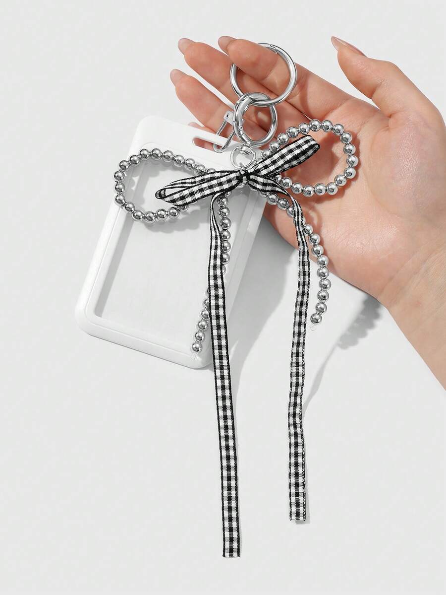 Kawaii 1pc Y2K Minimalist Versatile High-Quality Handmade Beaded Silver CCB Plaid Ribbon Bow Heart Woven Acrylic Card Holder Keychain Bag Charm, Suitable For Office Workers, Students, Daily Wear, Holiday Gift