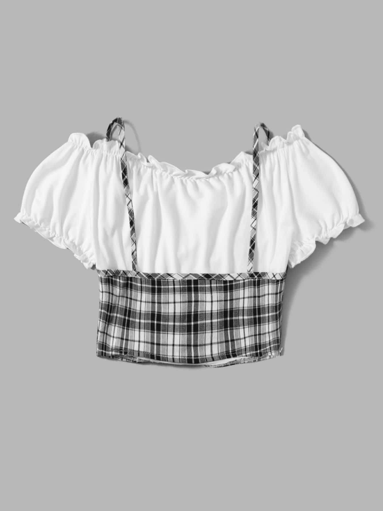 2 In 1 Plaid Lace Up Frill Crop Blouse