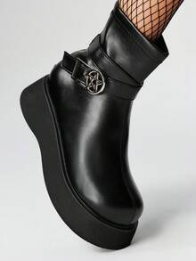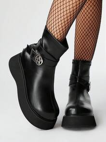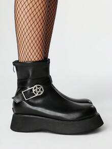 Grunge Punk 2.0in Heel Chunky Platform Chelsea Boots For Women, Round Star Buckle Decor Zipper Back Punk British Style Leather Wedge Ankle Boots, Casual Outdoor Commuting