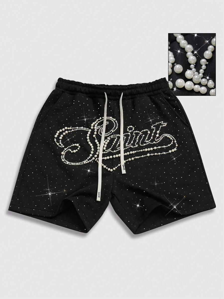 2026 Spring/Summer New Casual Fashion Y2K Style Men's Faux Pearl Letter Graphic Drawstring Waist Shorts