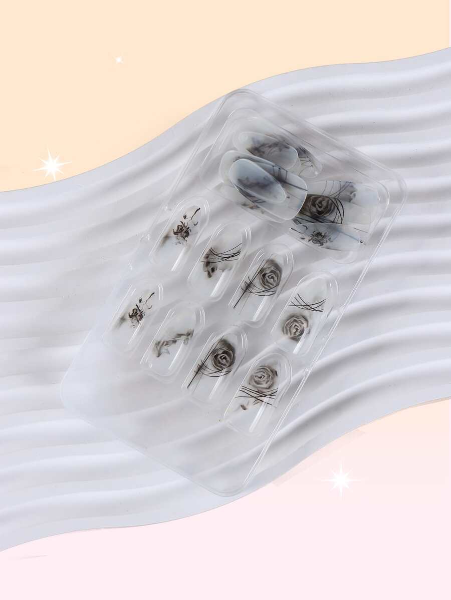 24pcs Almond Flower Print Fake Nail & 1sheet Tape