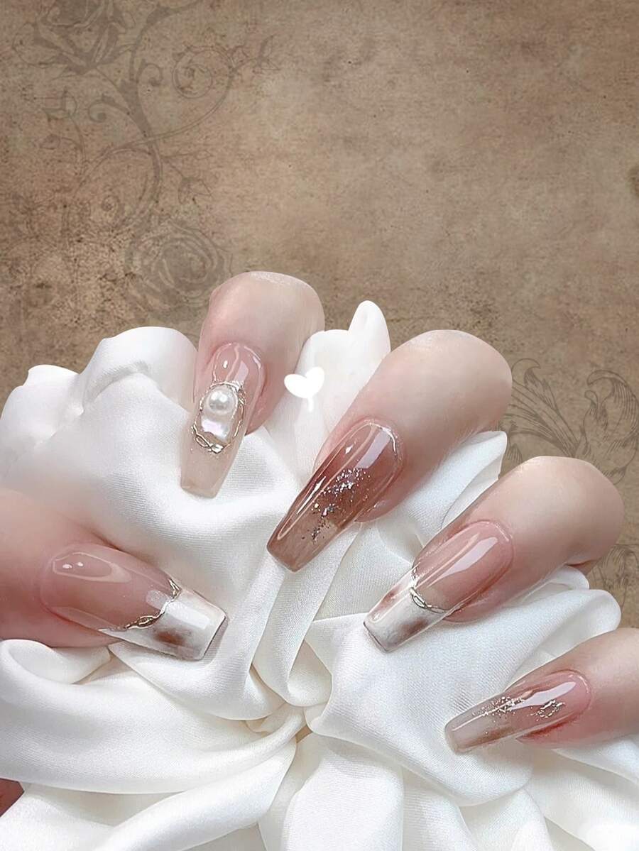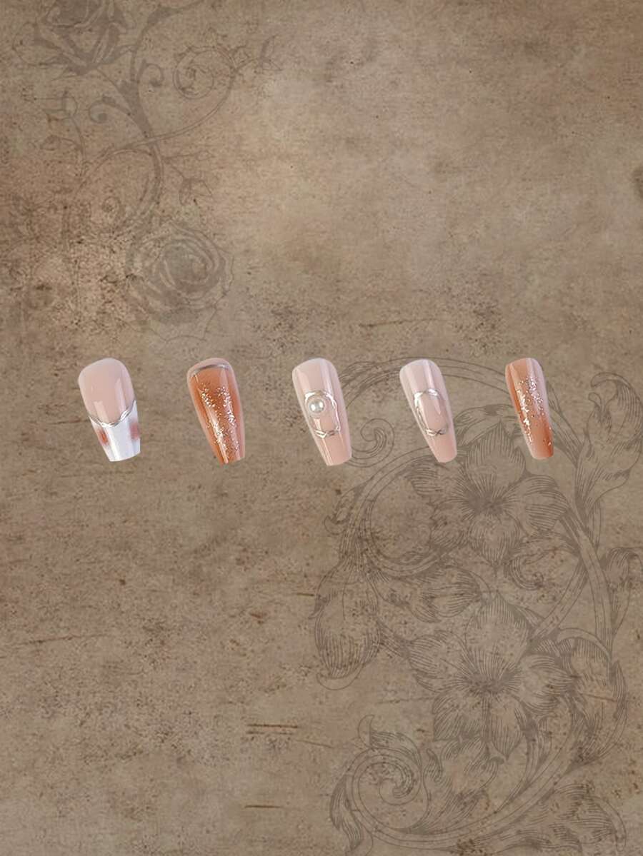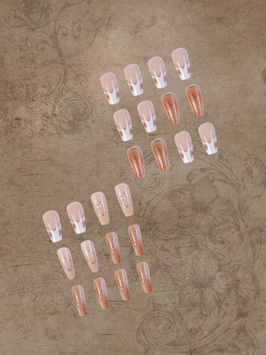 24pcs Coffin 3D Faux Pearl Decor Fake Nail & 1sheet Tape