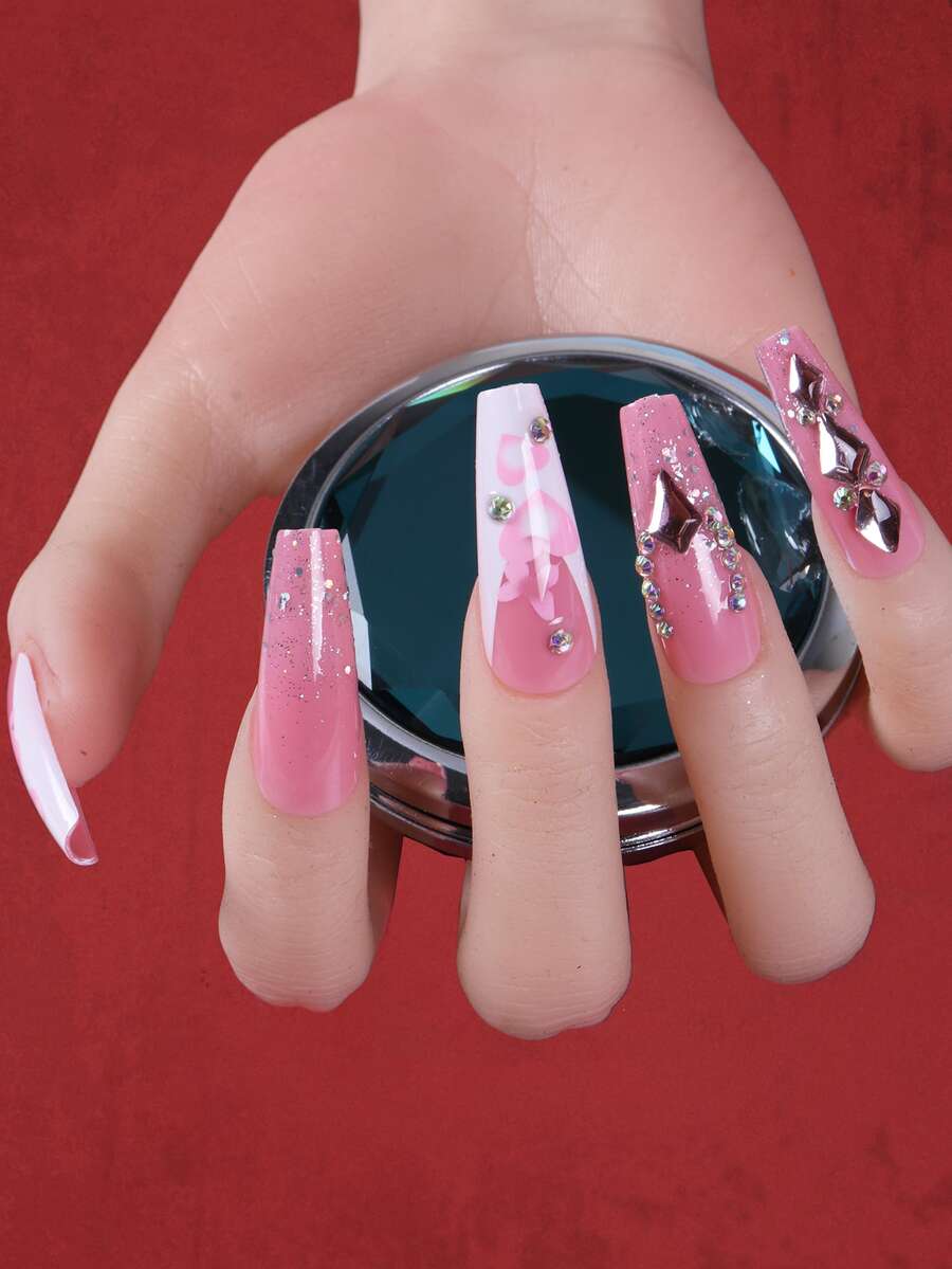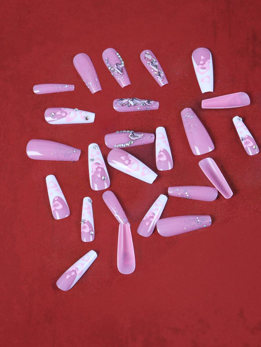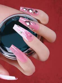 24pcs Coffin 3D Rhinestone Decor Fake Nail & 1sheet Tape