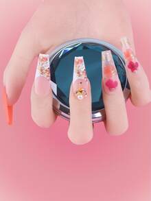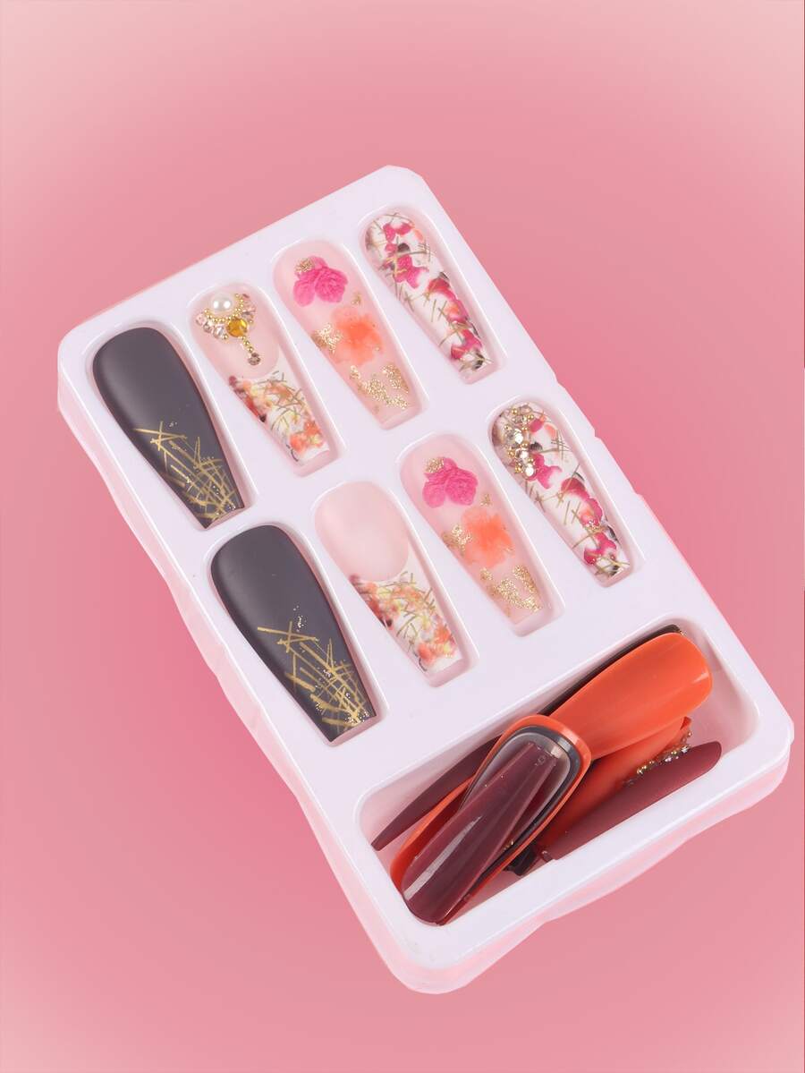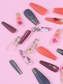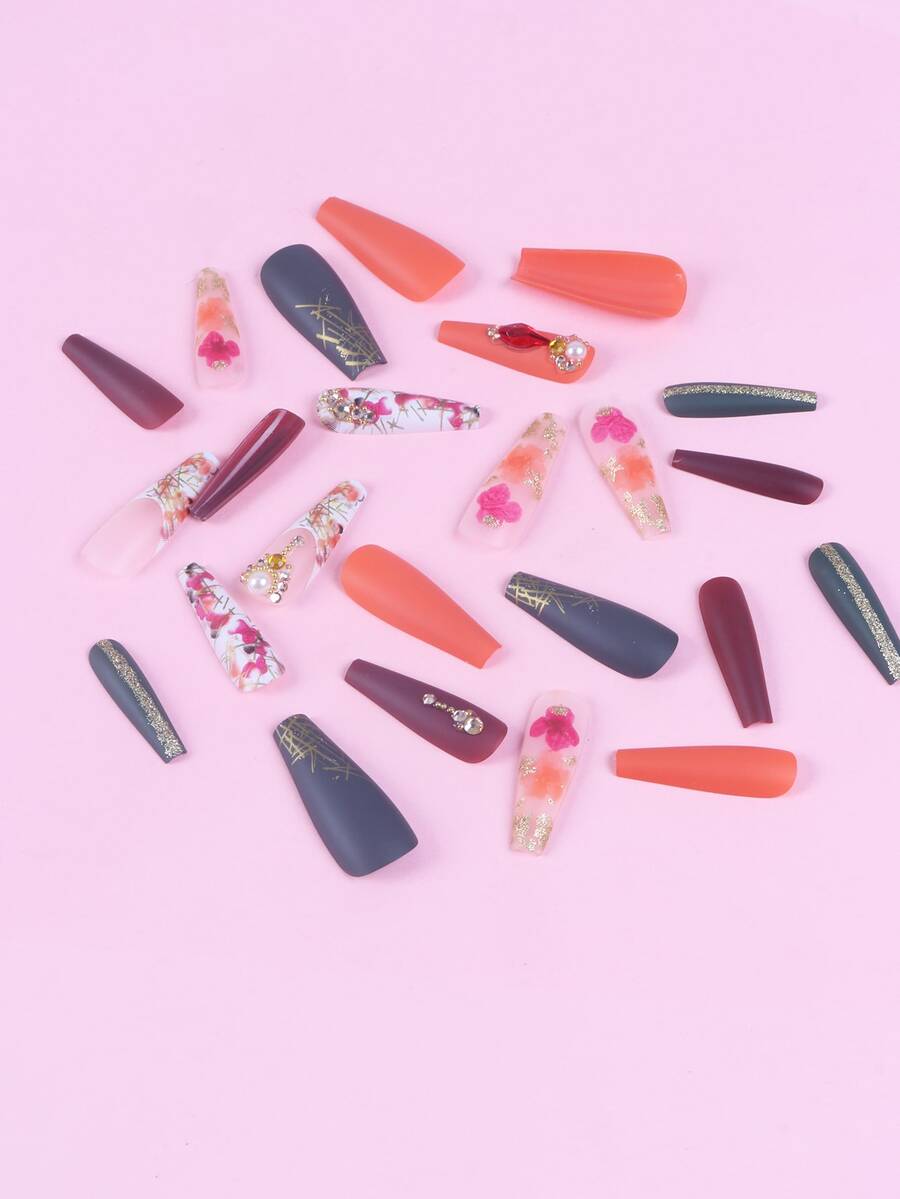 24pcs Coffin Flower Print Fake Nail & 1sheet Tape
