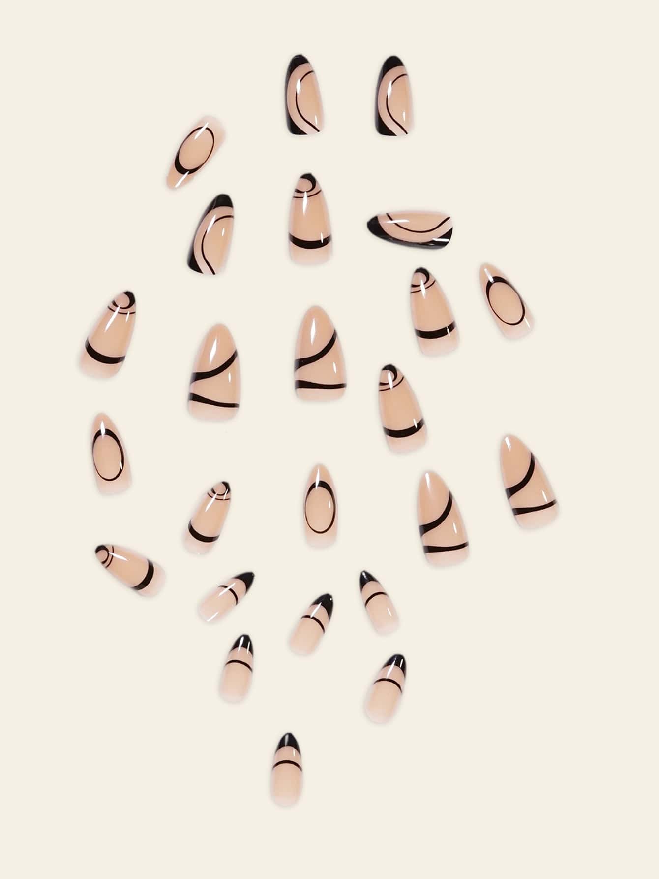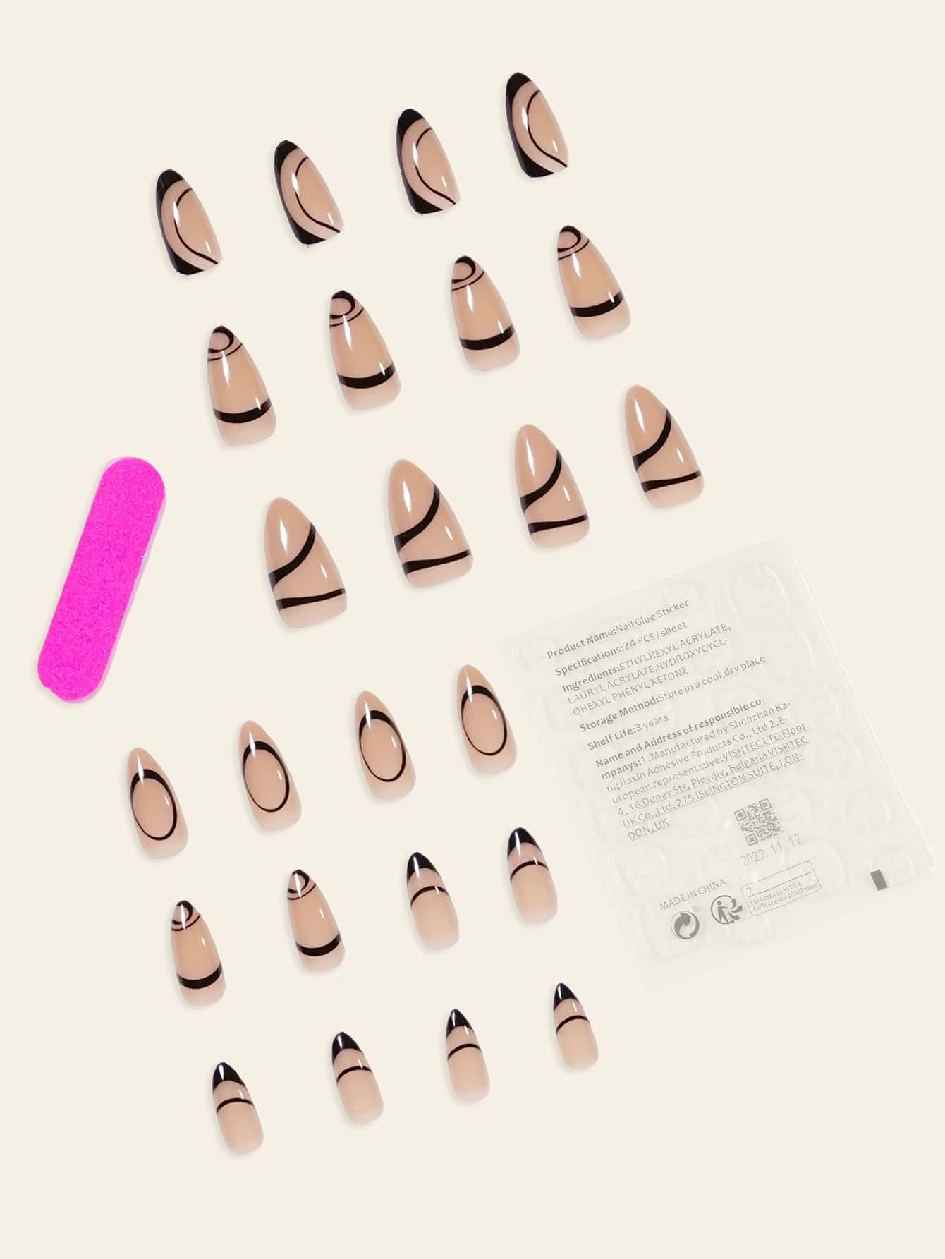 Transform Your Nails with 24pcs Long Almond Black Line Minimalist Fake Nail & 1pc Nail File & 1sheet Tape