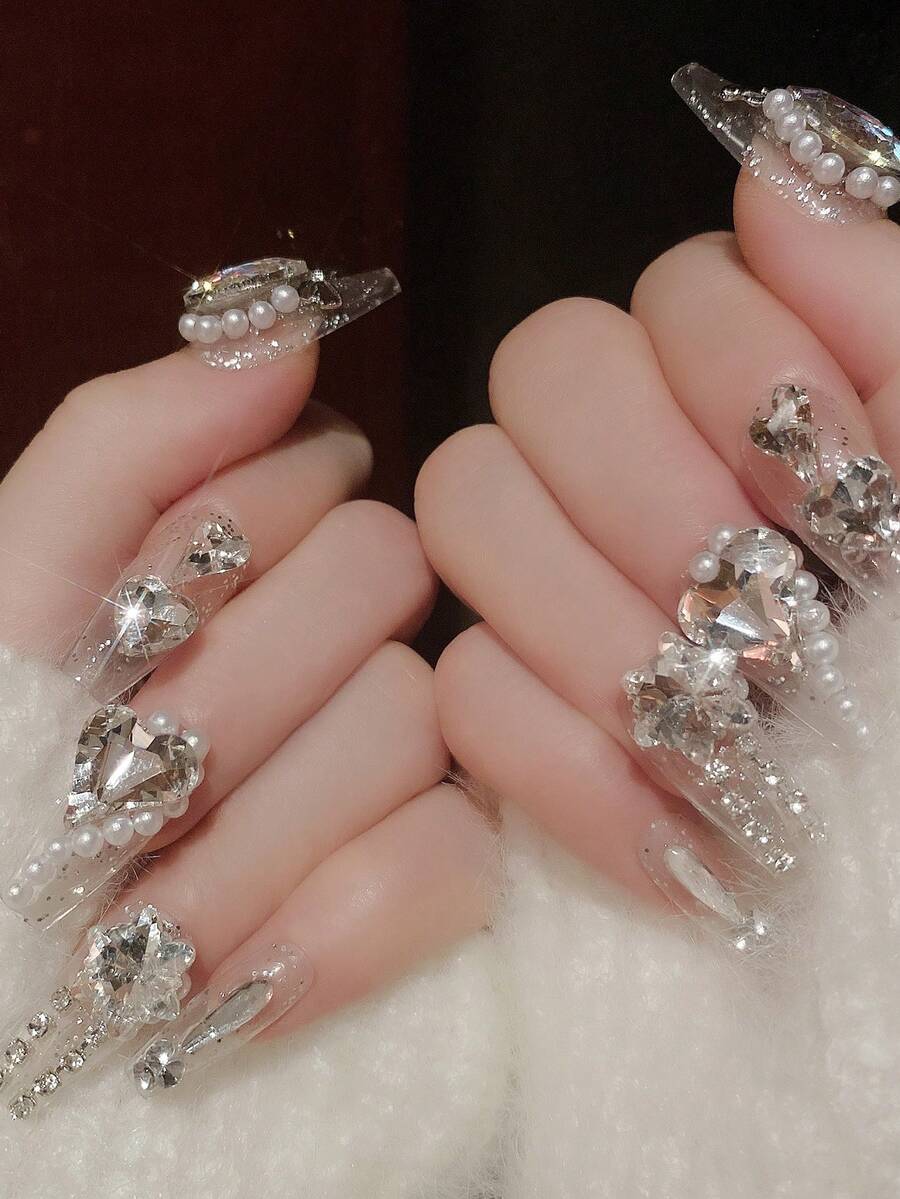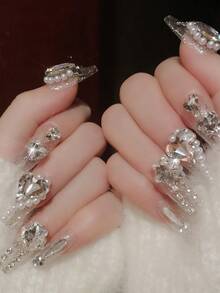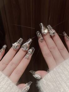 Kawaii 24pcs Long Coffin 3D Rhinestone Decor Fake Nail & 1pc Nail File & 1sheet Tape