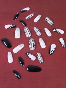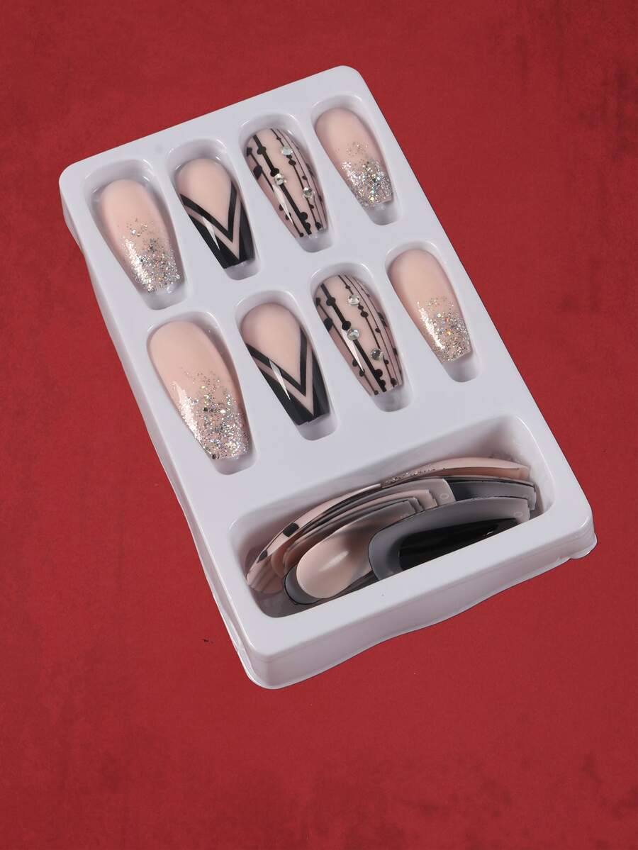 24pcs Long Coffin 3D Rhinestone Decor Fake Nail & 1sheet Tape