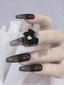 Kawaii 24pcs Long Coffin Bow Decor Fake Nail & 1sheet Tape