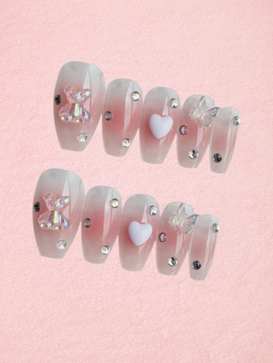 Kawaii 24pcs Long Coffin Heart Decor Fake Nail & 1sheet Tape