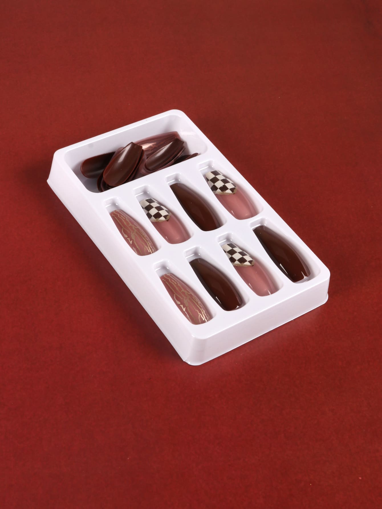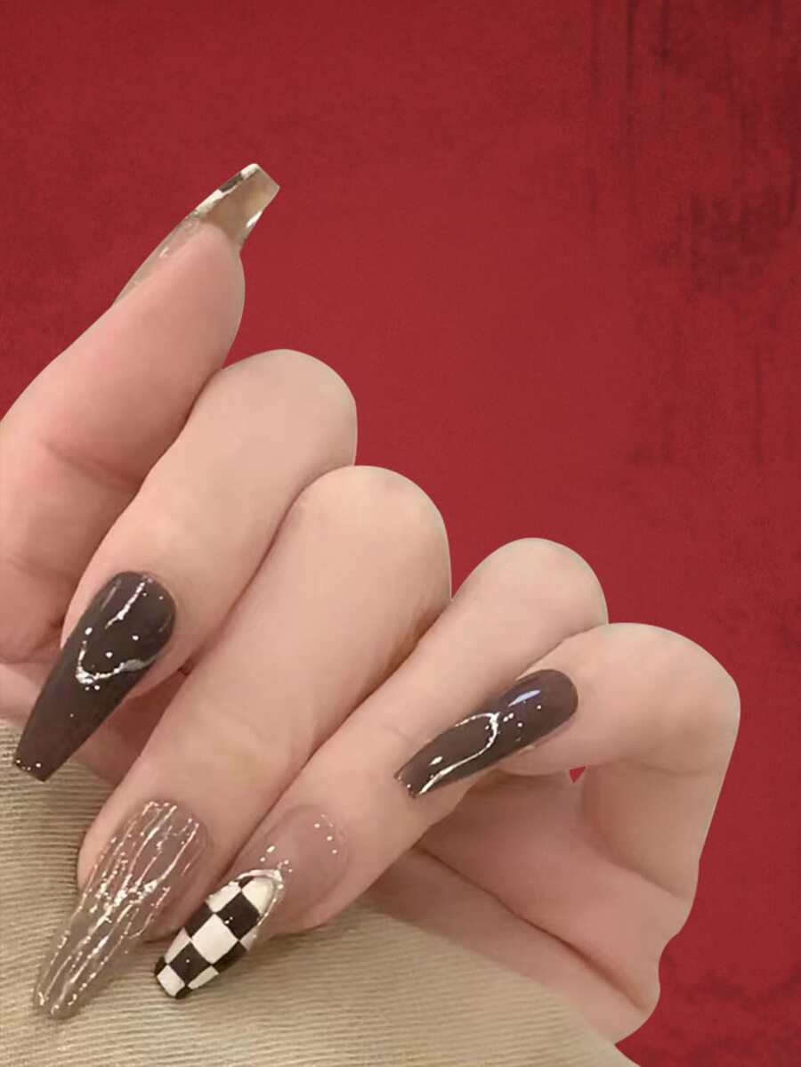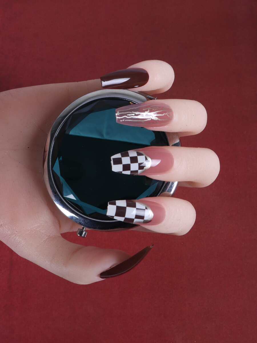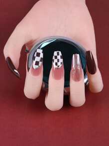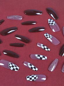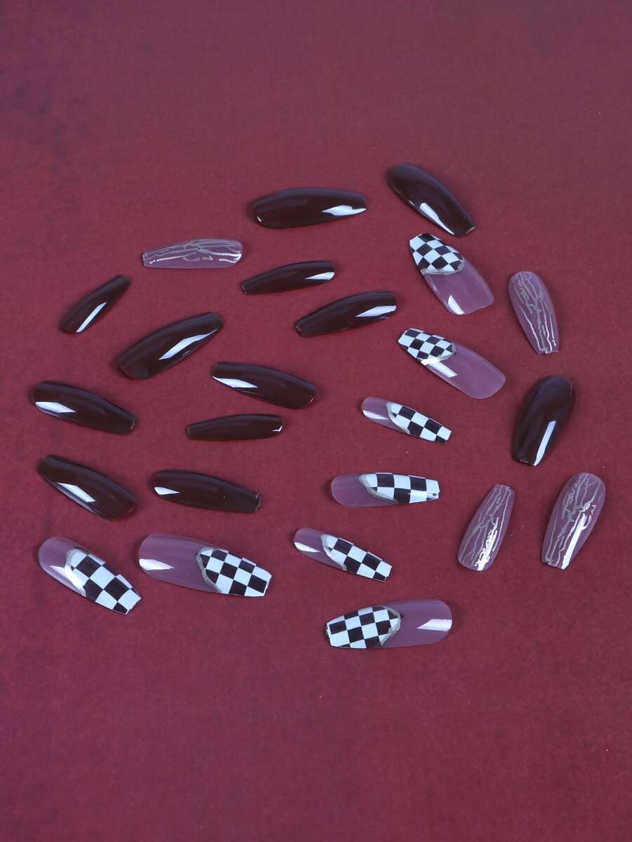 24pcs Long Coffin Plaid Pattern Fake Nail & 1sheet Tape