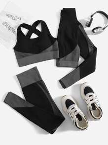 2pcs Seamless Pinstripe Gym Set Athletic Suit Sports Bra & Jacket & Leggings