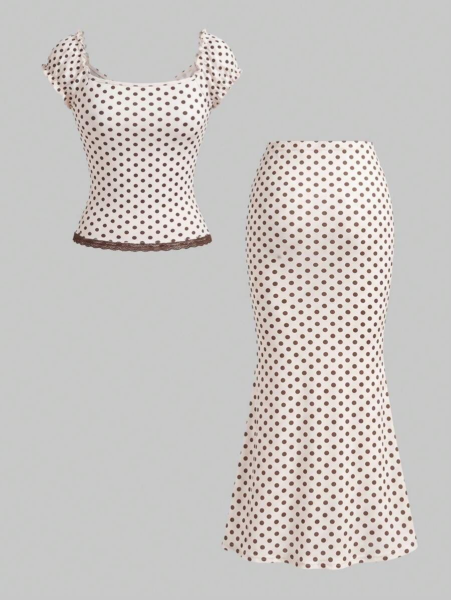 Kawaii 2pcs/Set Women's Summer Outfits, V-Neck Bowknot Decor Contrast Polka Dot Lace Patchwork Slim Fit Blouse And Skirt