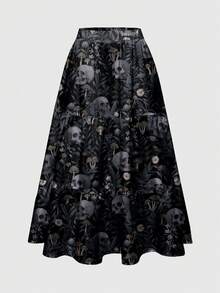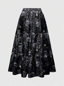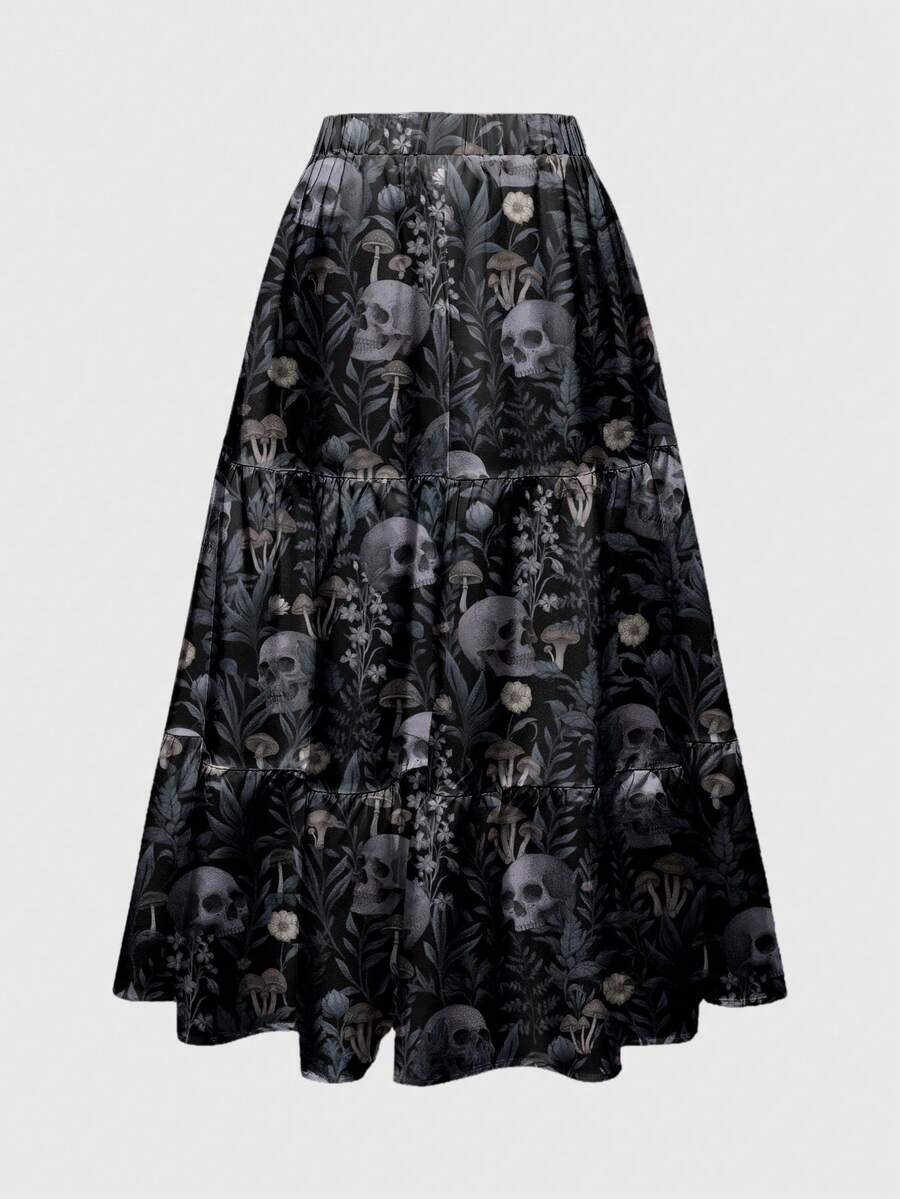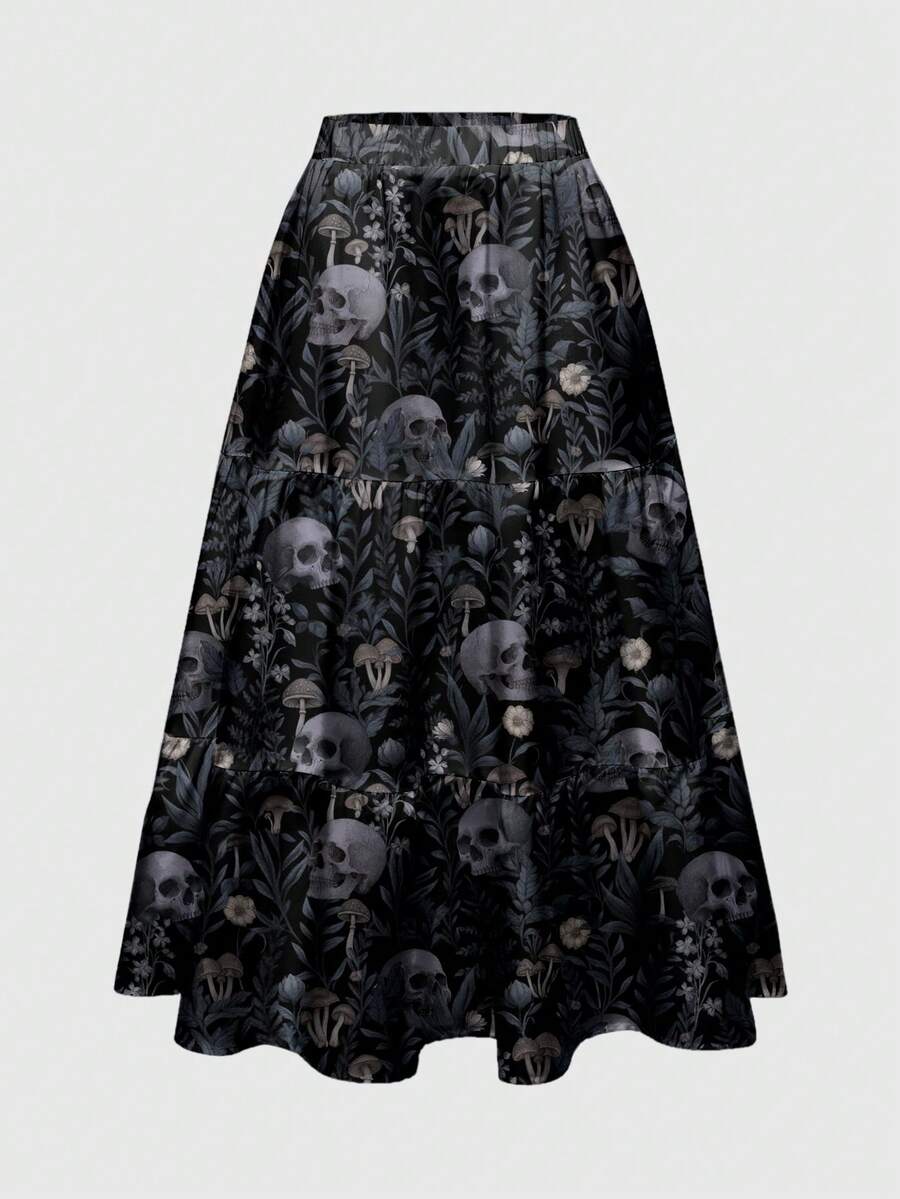 Goth 3-Layer Mysterious Skull & Leaf Print Romantic Bohemian Style Black & Blue Mini Skirt For Women