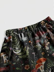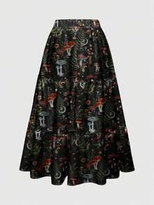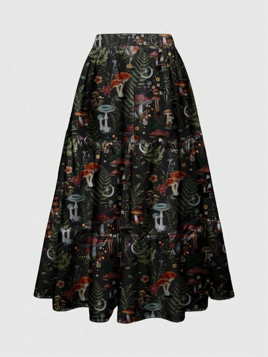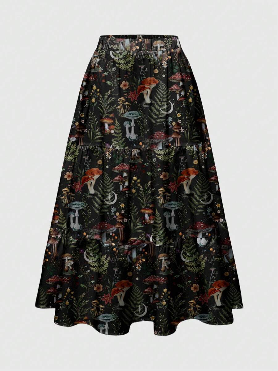 Fairycore 3-Layer Women Mushroom & Leaf Allover Print Goth Skirt With Sun, Moon & Star Patterns, Autumn/Winter