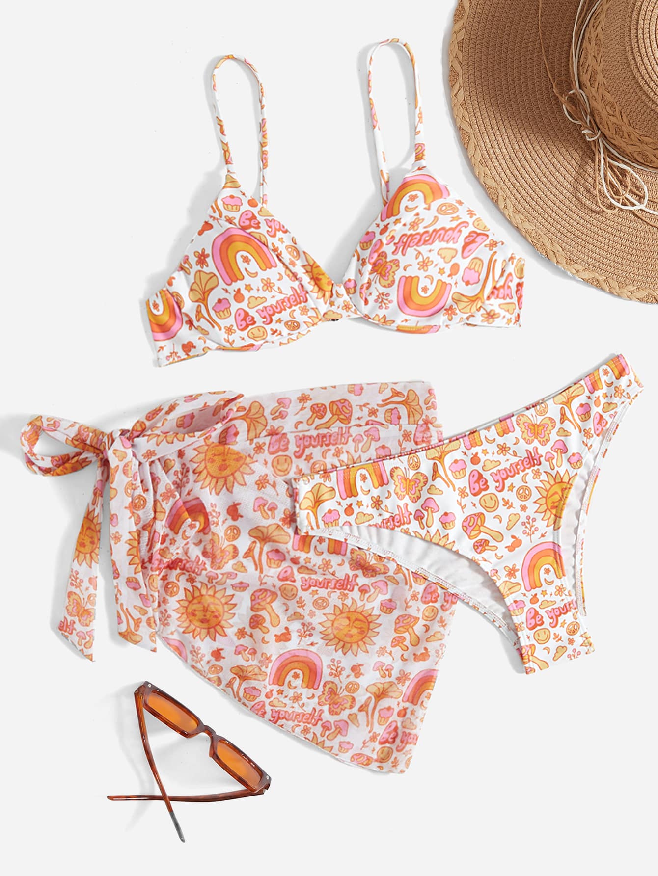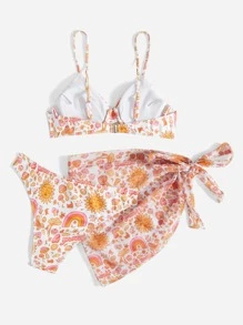 3packs Cartoon Print Bikini With Beach Skirt