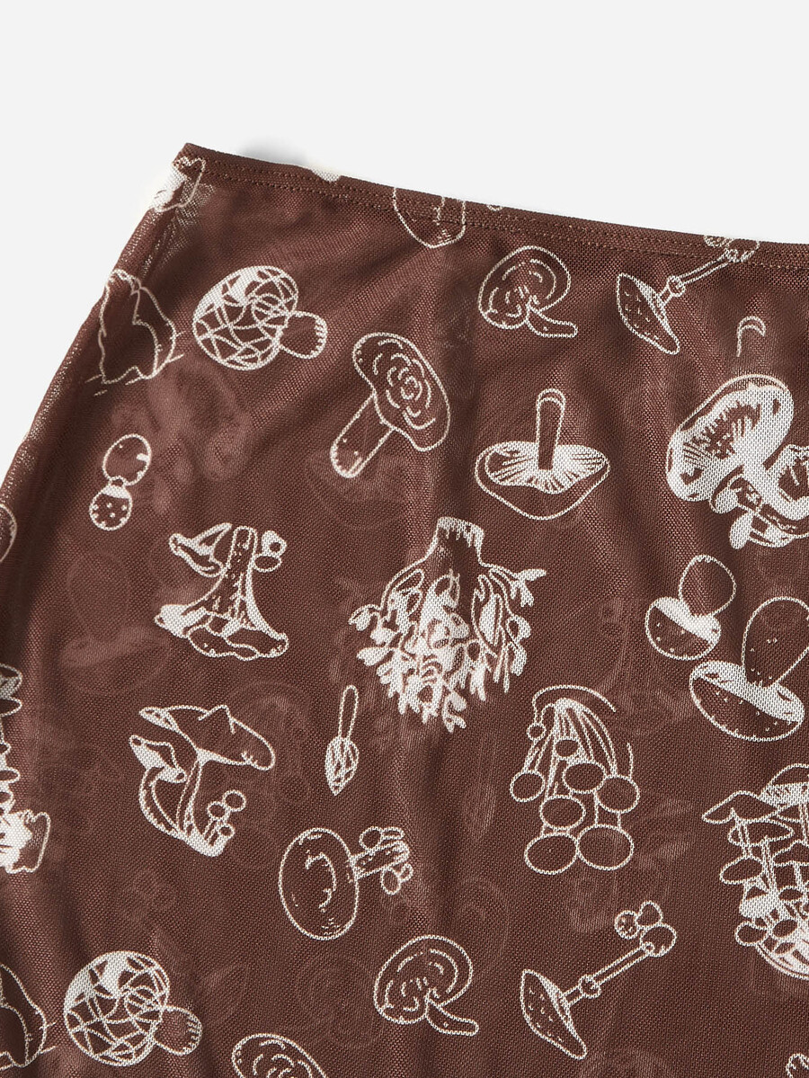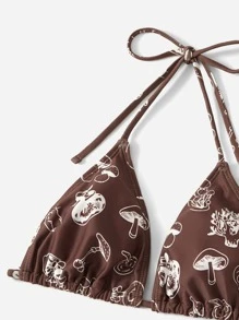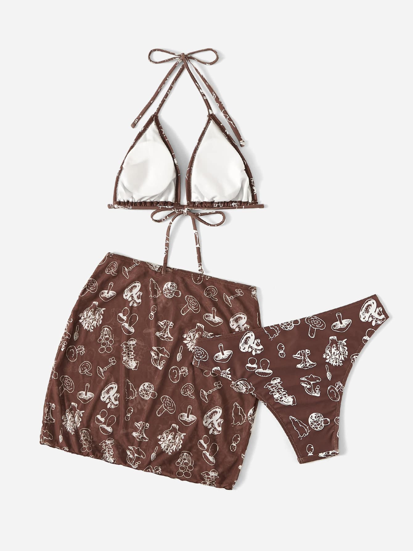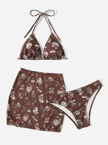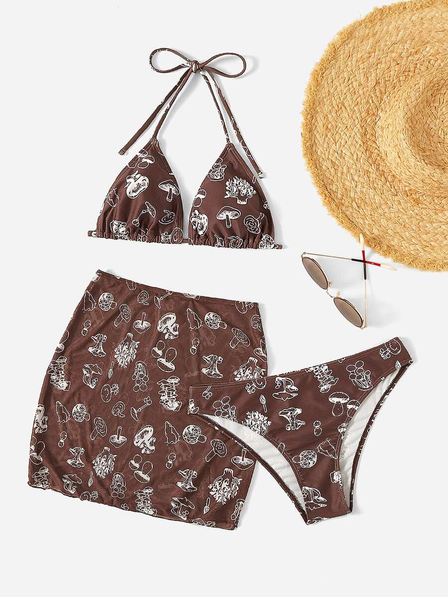 3packs Mushroom Print Halter Bikini & Beach Skirt