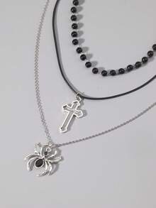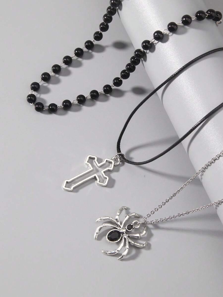 3pcs Gothic Dark Glass Crystal Cross, Heart Pendant Necklace, Personalized Hip Hop Multilayer Necklace For Women, Holiday Gift, Halloween