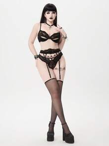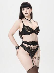 3pcs Gothic Hollow Underwire Bralette, G-String, And Garter Belt Sexy Lingerie Set
