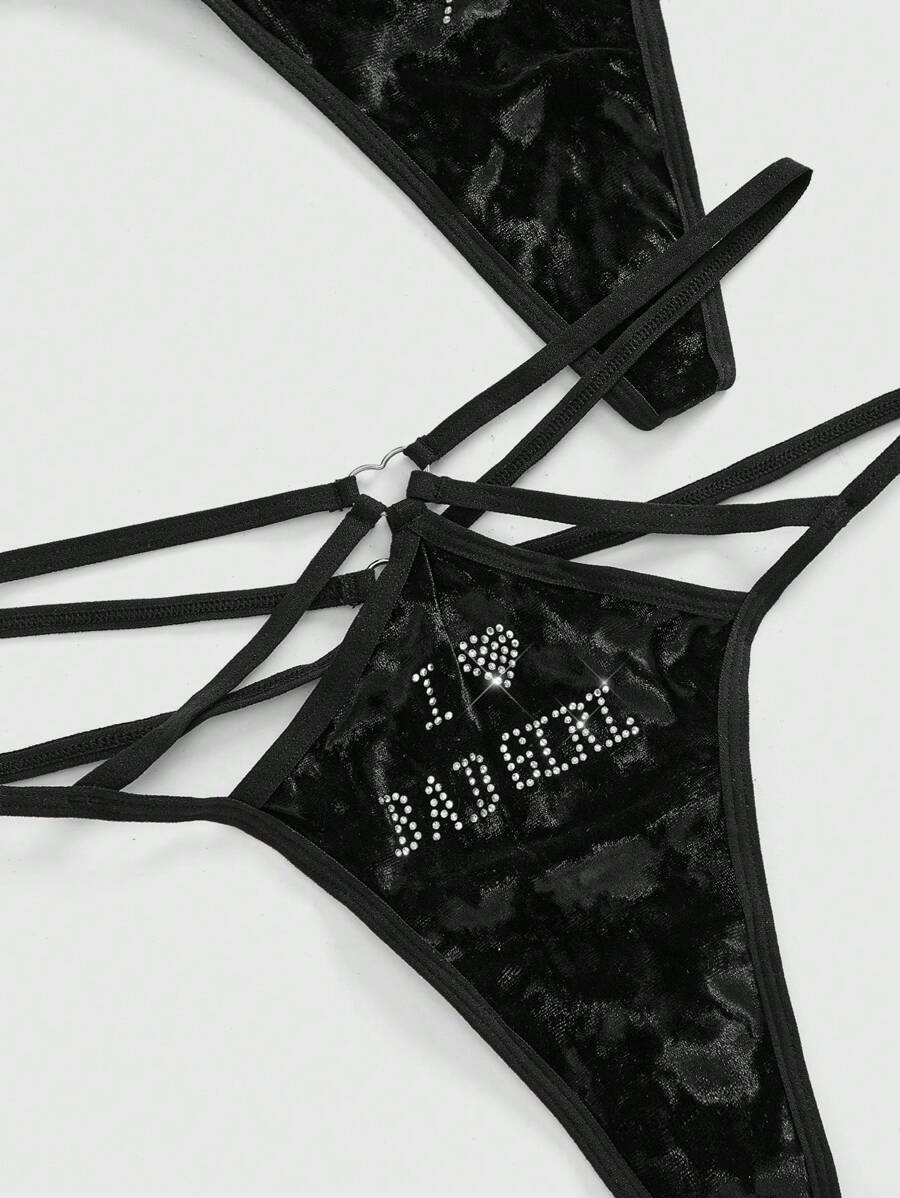 3pcs/Set Gothic Romantic Velvet Rhinestone Rose Heart Letter Thong Panty Set