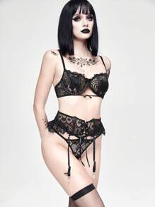 3pcs/Set Gothic Sexy Hollow Lace Bralette, Panty & Garter Belt Lingerie Set