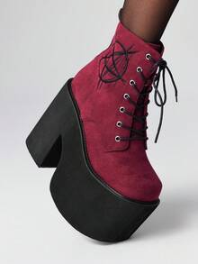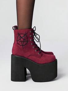 Goth 5.7in Thick Sole Waterproof Platform Short Boots, Autumn/Winter Side Zipper Closure Round Toe, Punk Style Star Embroidered Suede Ankle Boots In Black And Burgundy, European Fashion Stage Performance Wedge Shoes For Women