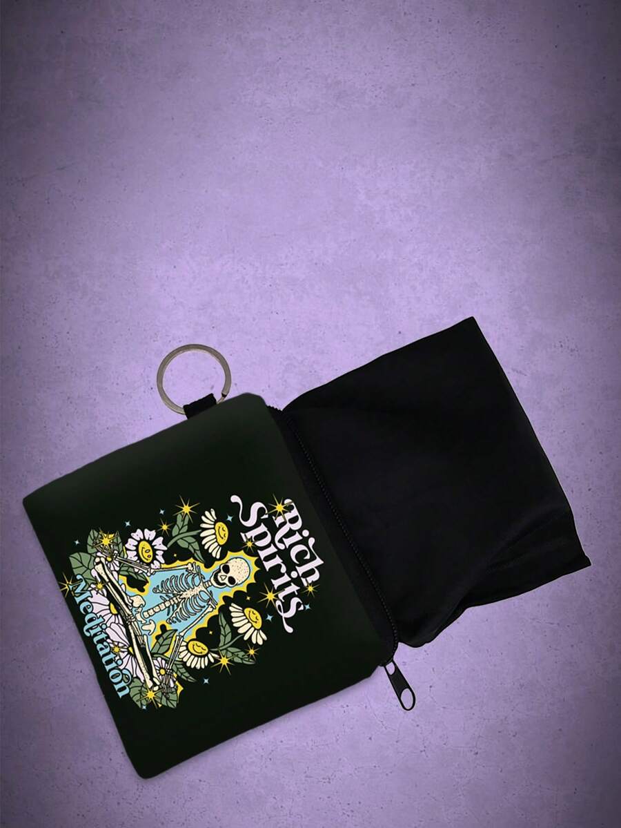 9over10Studios Black Coin Purse With Skull & Flower Print