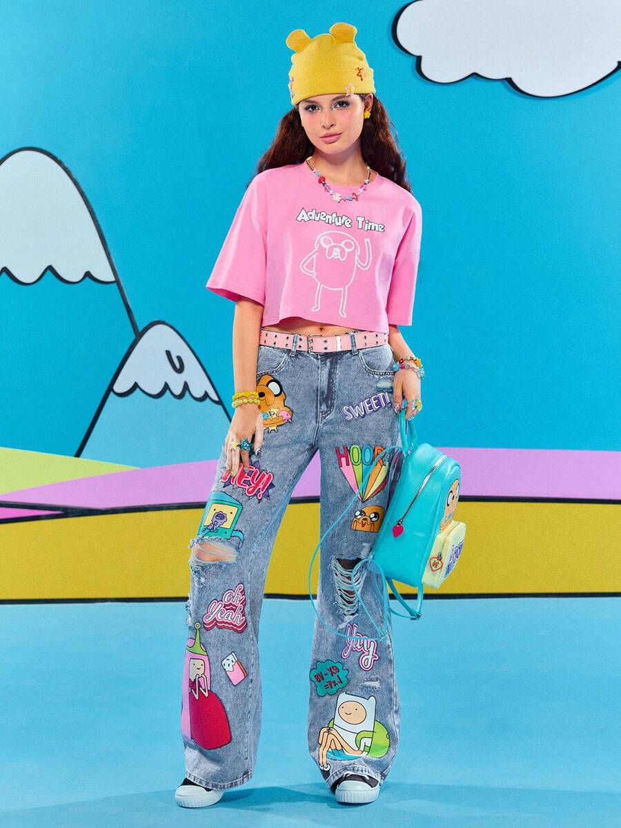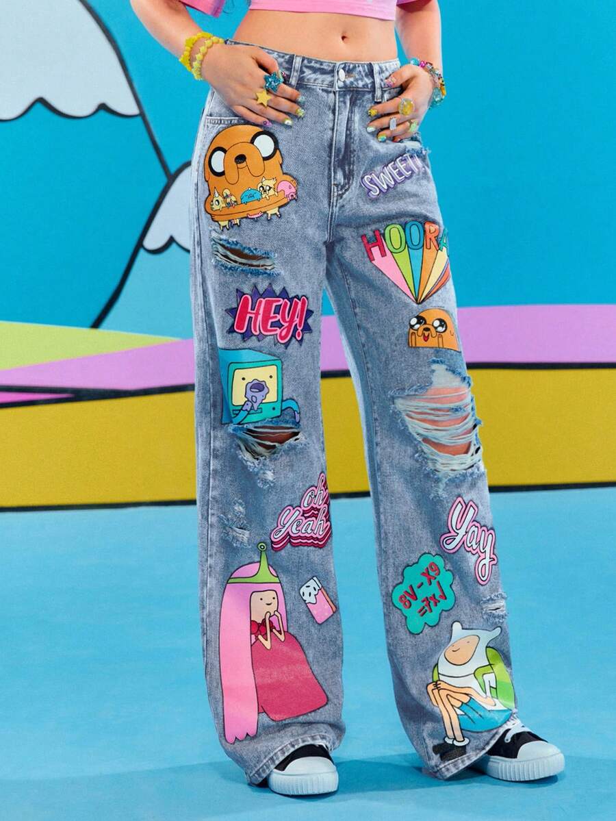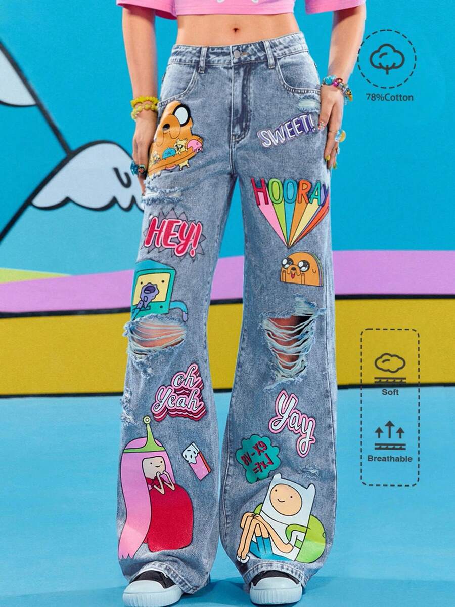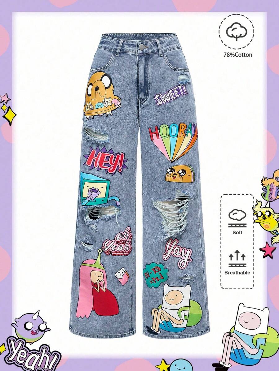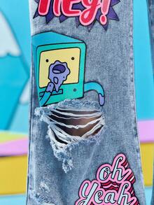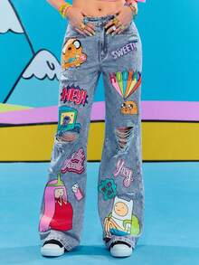 Adventure Time X ROMWE Cartoon Graphic Ripped Loose Fit Flare Leg Jeans