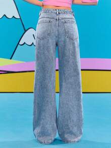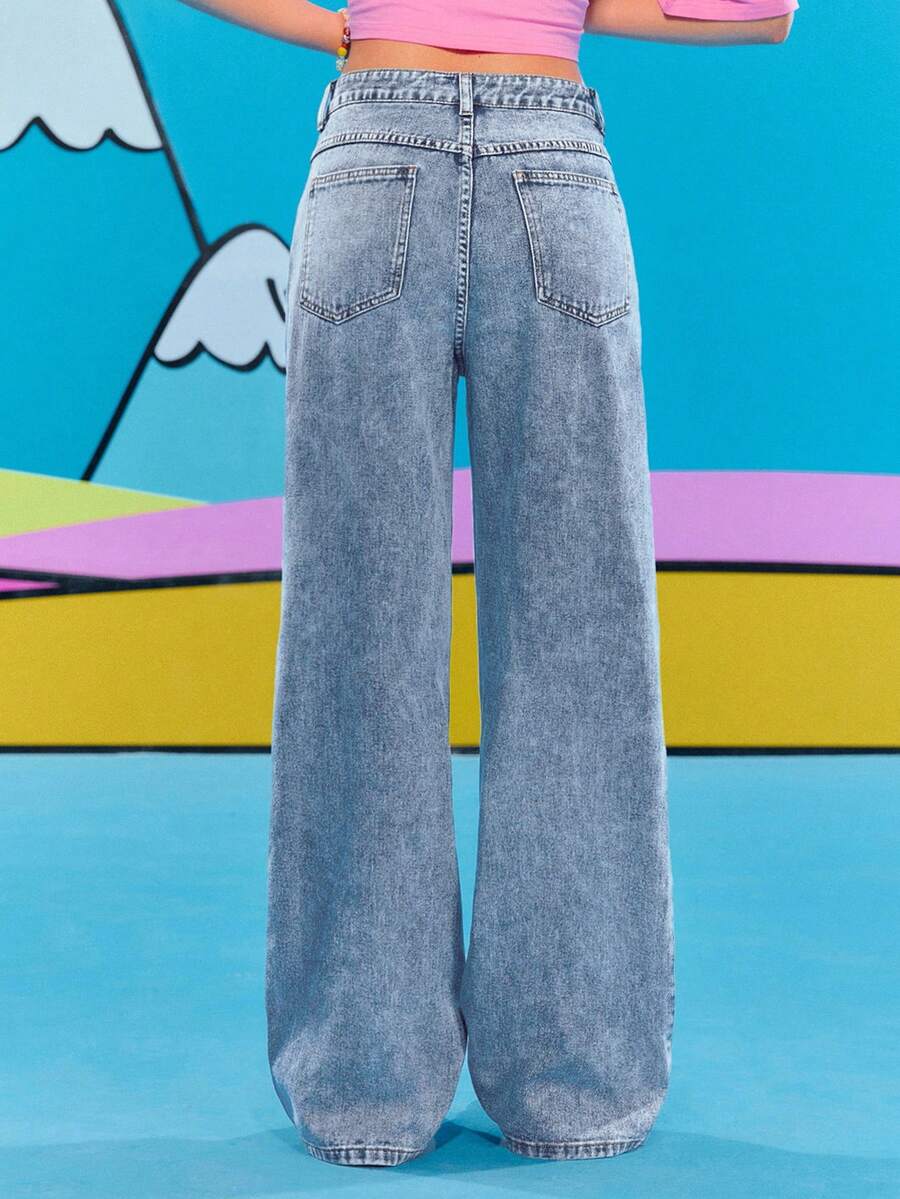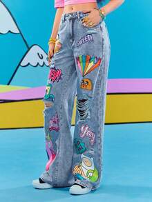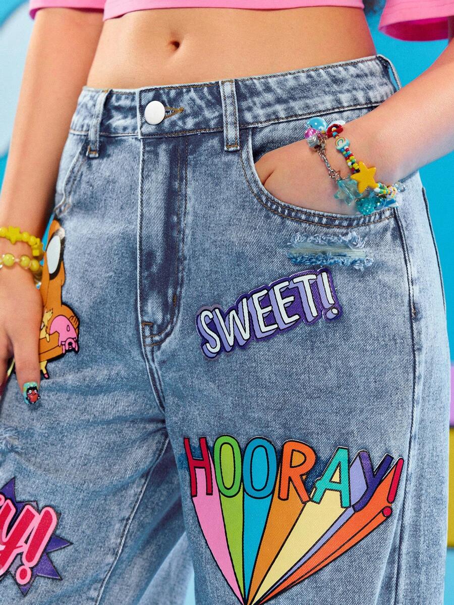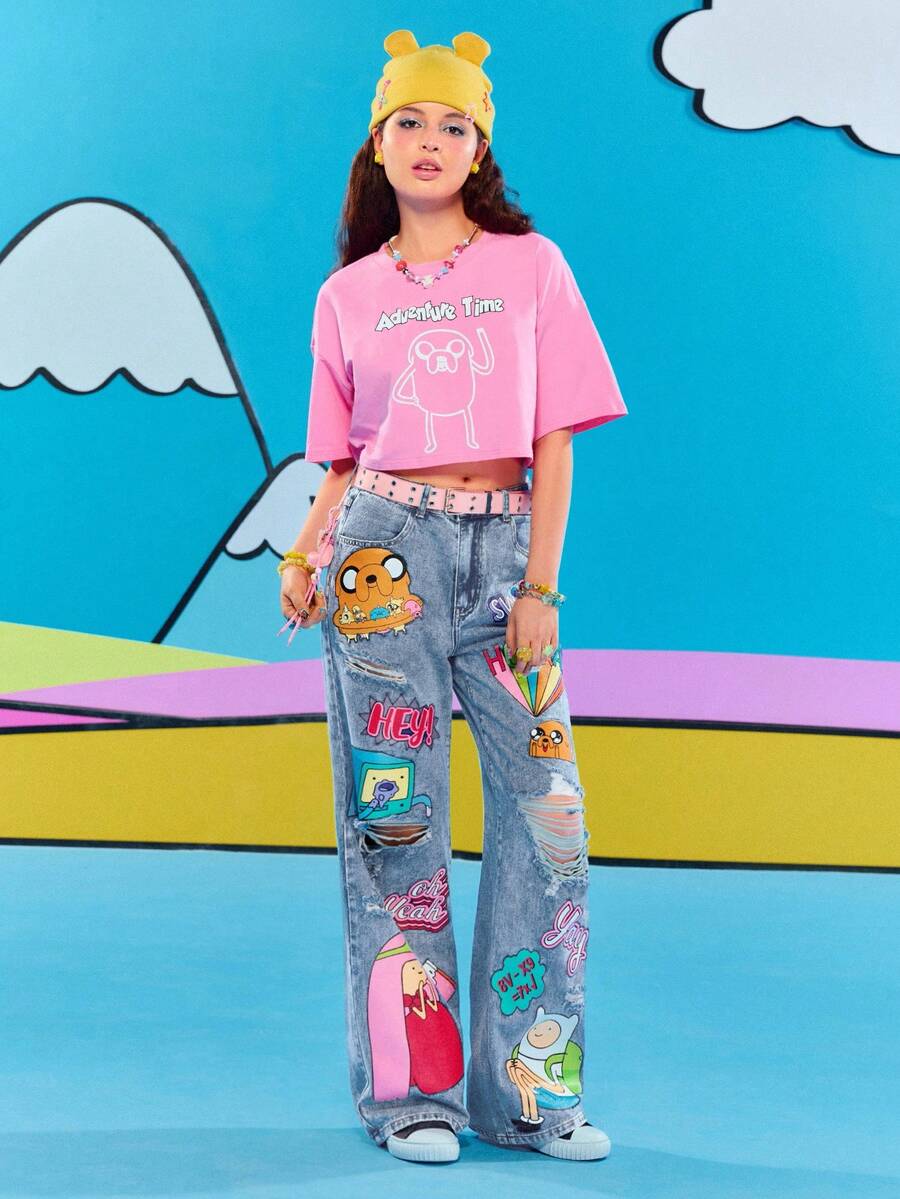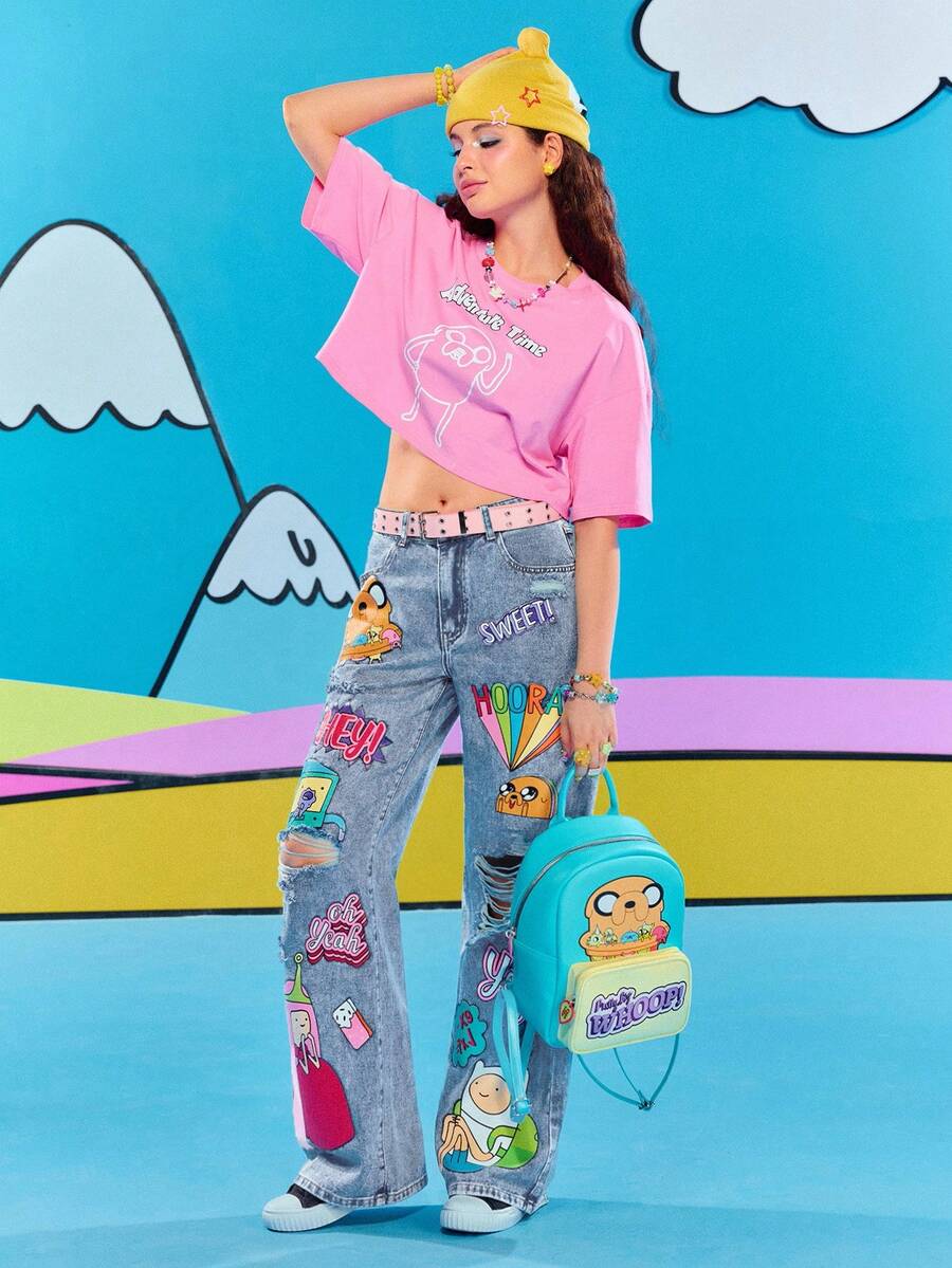 Adventure Time X ROMWE Cartoon Graphic Ripped Loose Fit Flare Leg Jeans