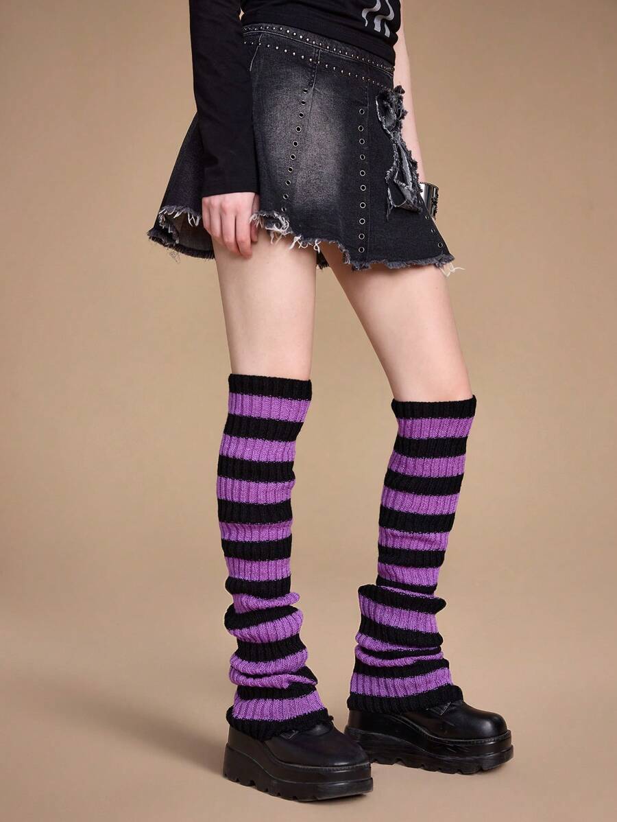 Anime 1 Pair Women All-Season 75cm Stripe Leg Warmers, Purple & Black